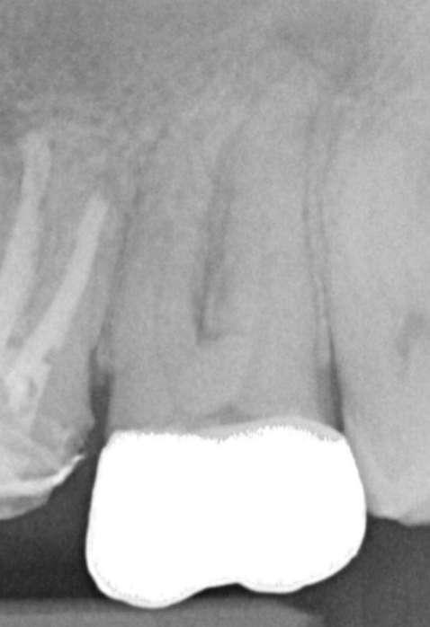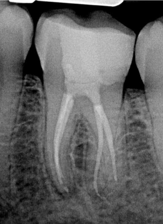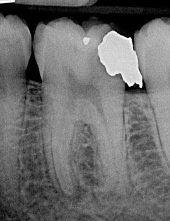 Das präoperativ angefertigte diagnostische Röntgenbild zeigt eine insuffiziente Amalgamfüllung im distalen Approximalraum. Die mesiale Wurzel weist eine periapikale Osteolyse auf (Abbildung 1).