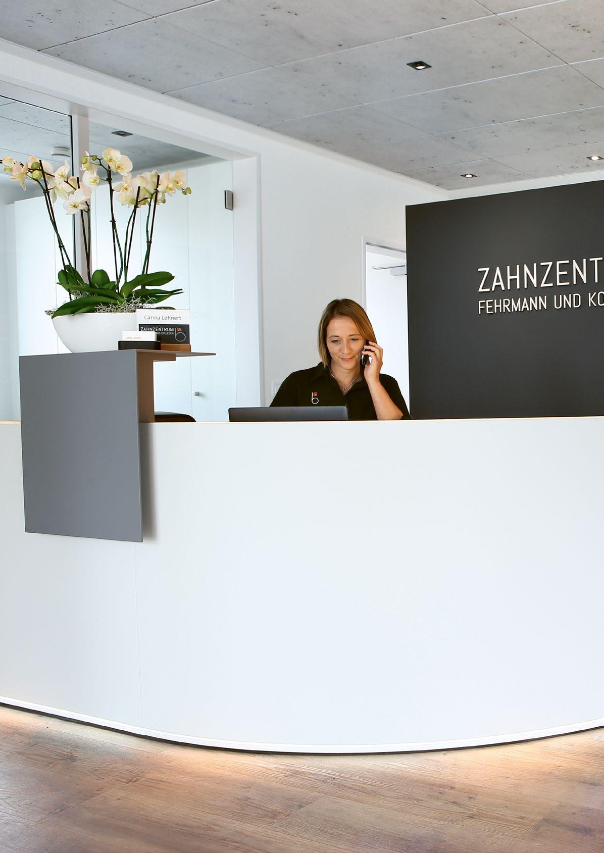> Empfangen mit einem Lächeln: die Rezeption in der Praxis „Zahnzentrum b06 Fehrmann und Kollegen“.