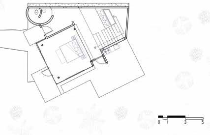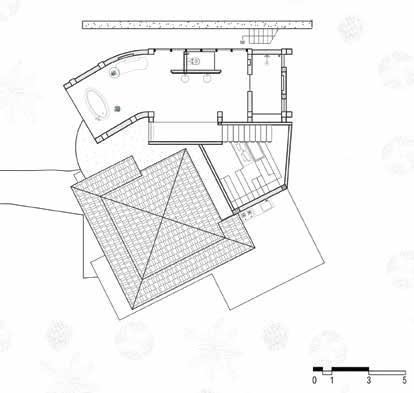 The bathroom is placed on the upper terrace, where the substructure can still be modified, allowing for a response to the rice field view with an opening angle slightly opposite to the direction of the terracing. Meanwhile, the bedroom is designed with offering an opportunity to enjoy a panoramic view of the forest. It is designed with a traditional building concept, raised on a structure of steel and wood to avoid overloading the previously created terraces. The relatively cool climate of Malino allows for wide-open windows, creating a seamless interaction between indoor and outdoor spaces. The quality of the forest view and the quiet sounds are utilized by offering various openings and viewpoints from different functions.