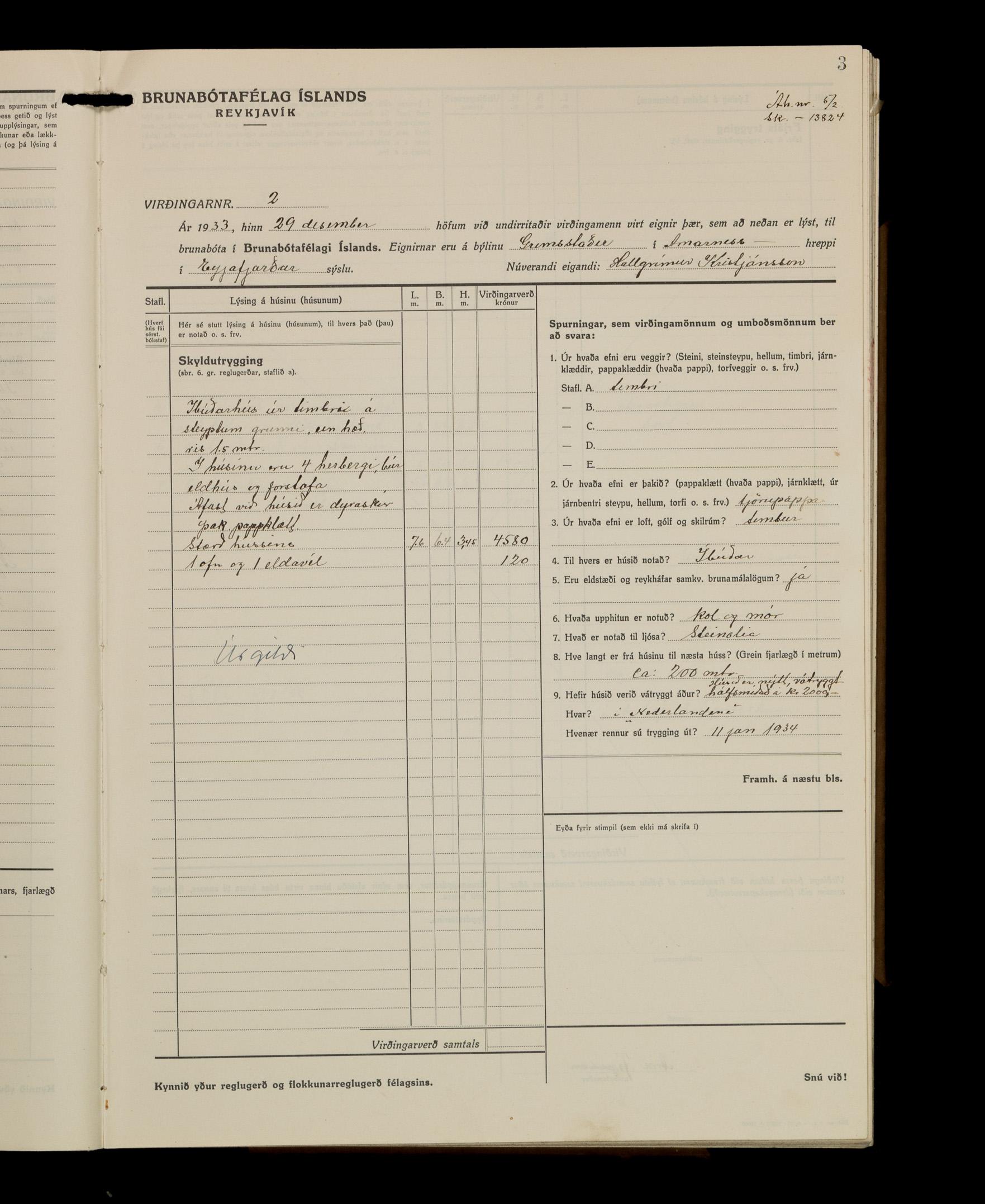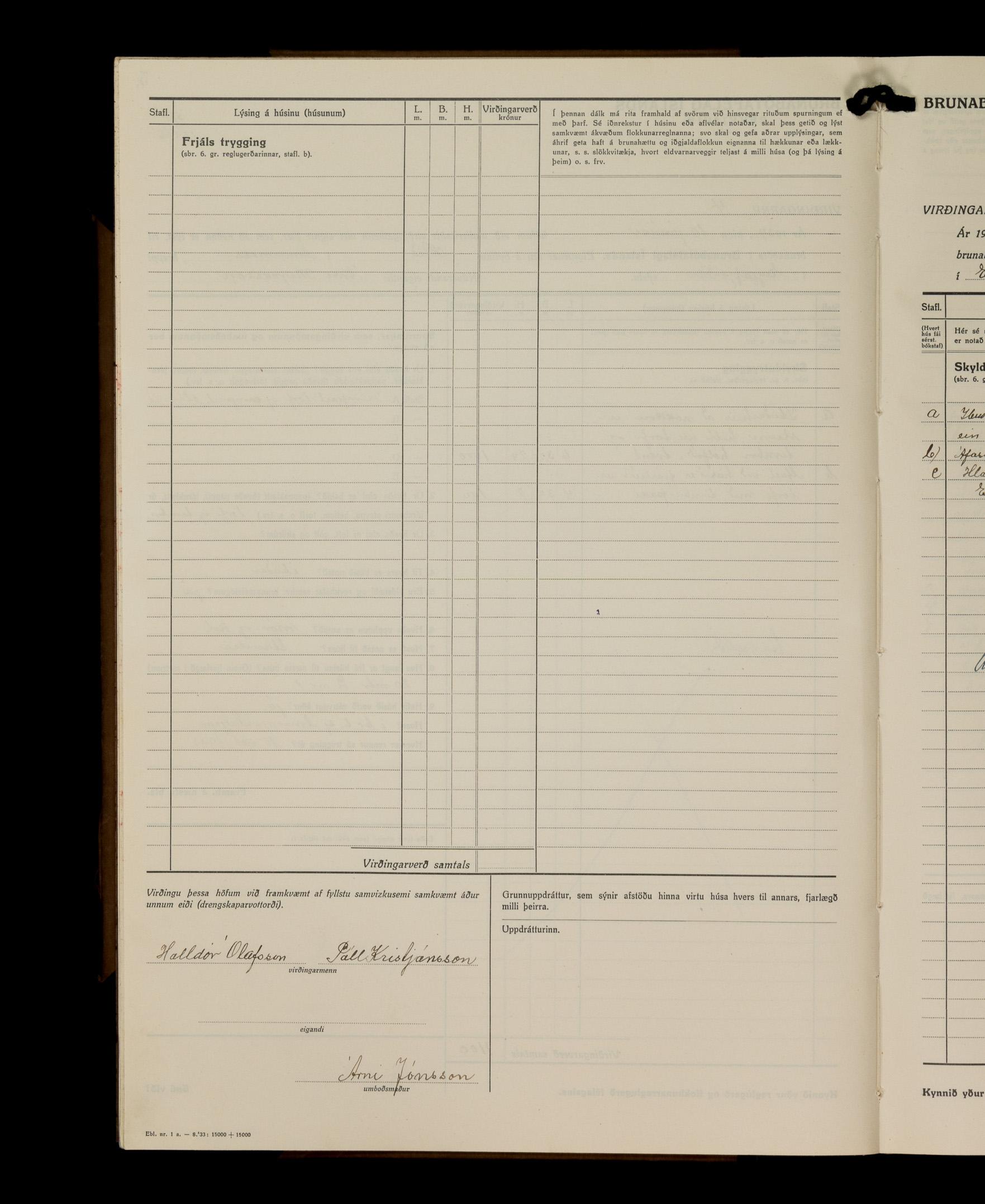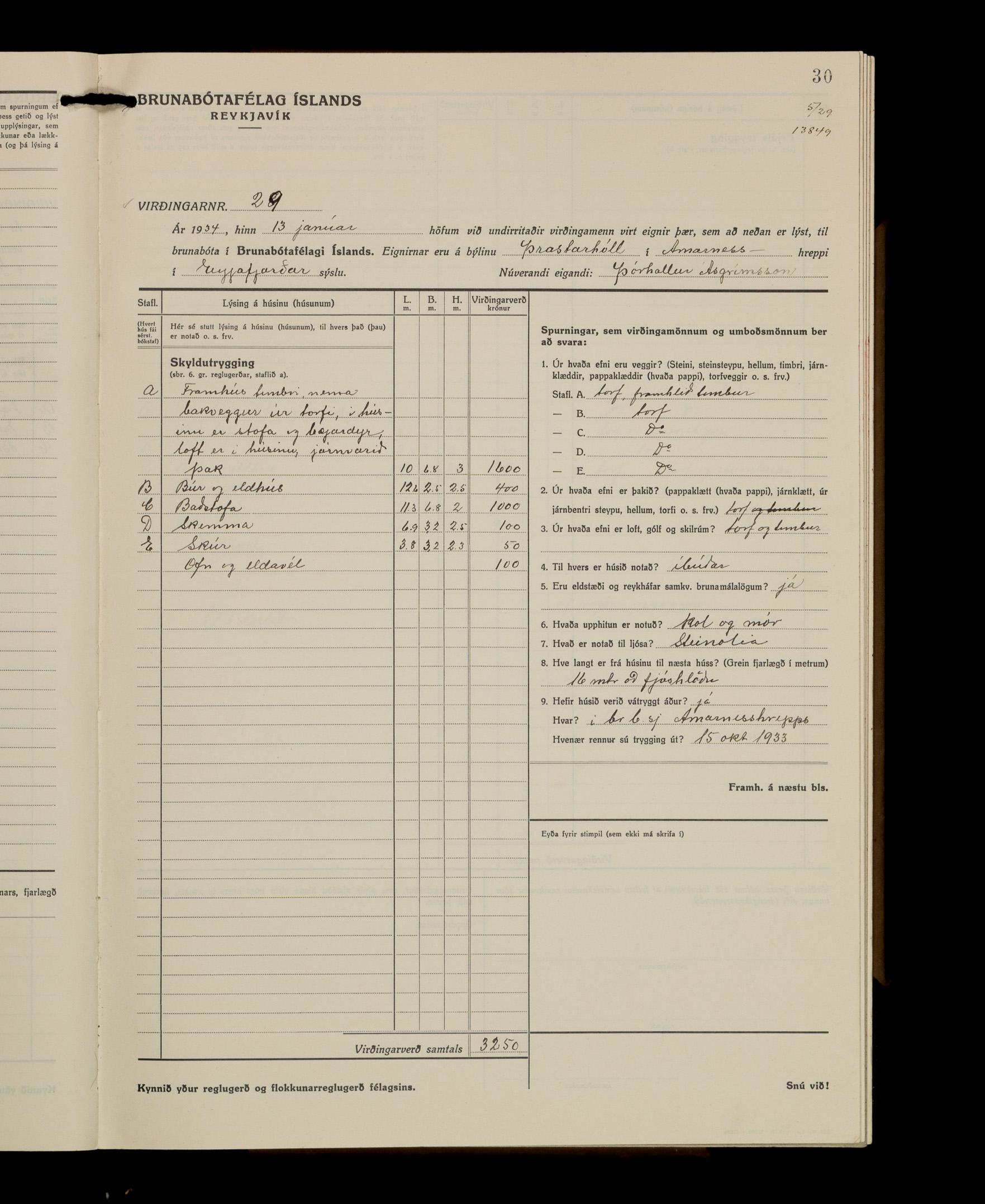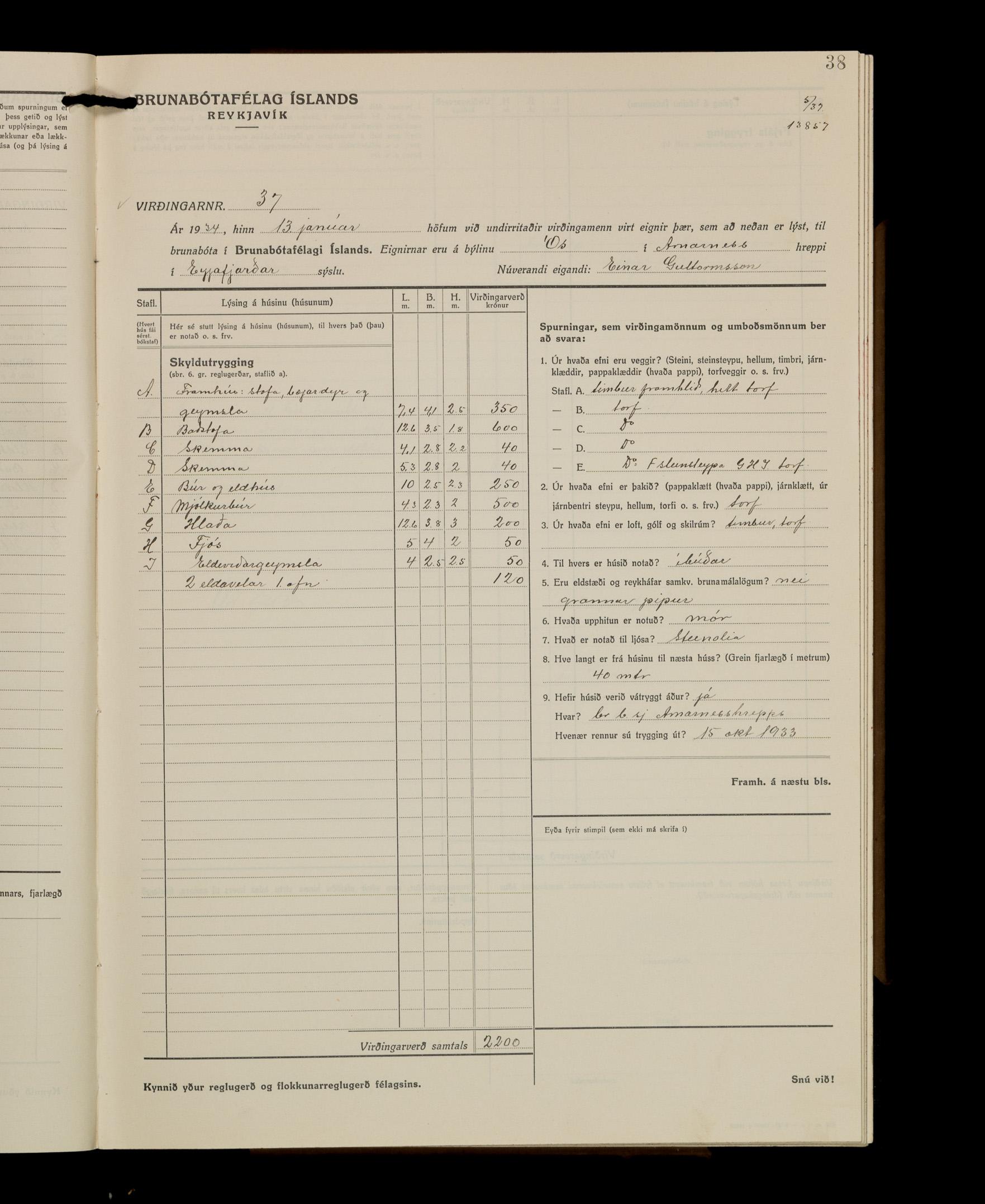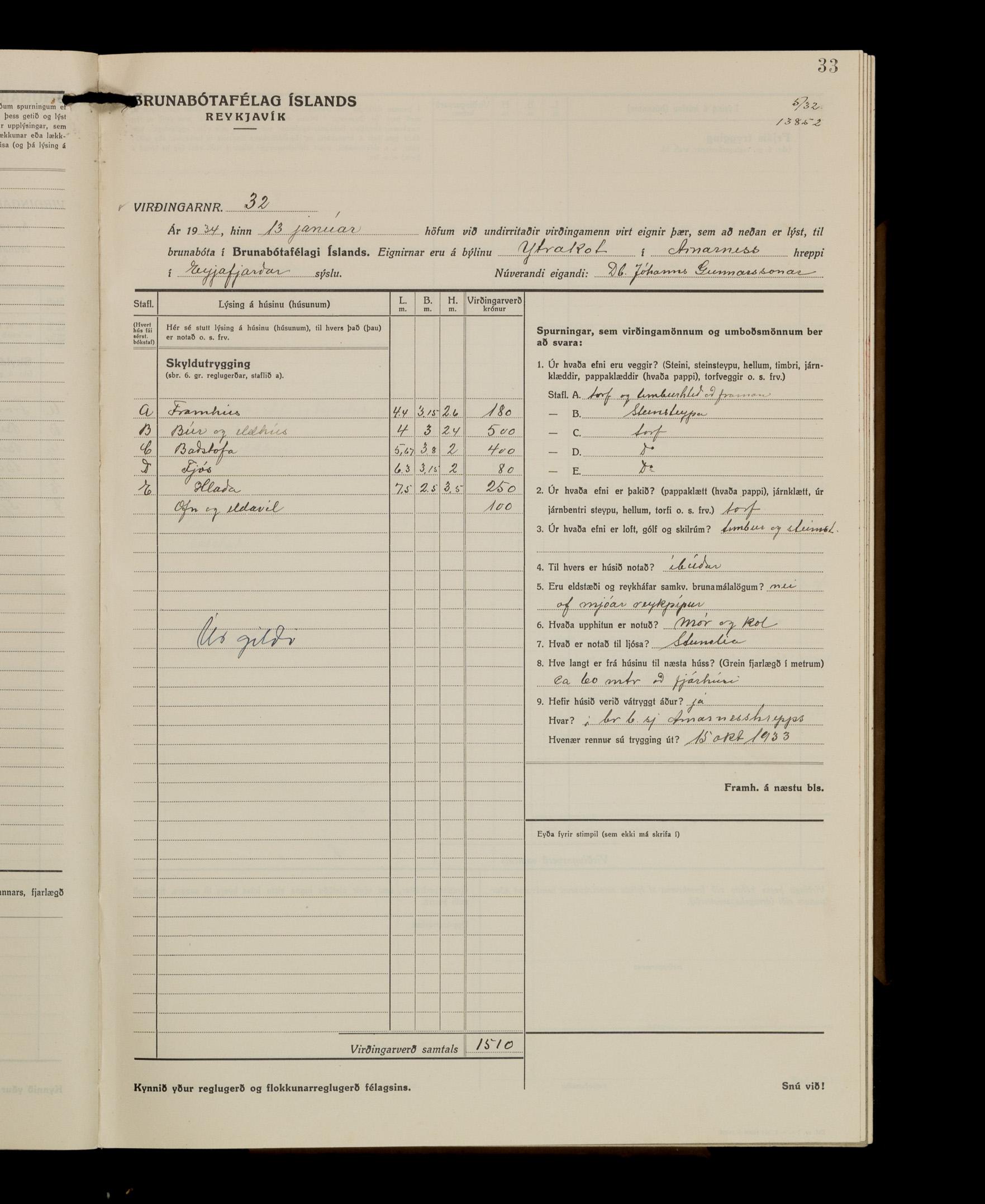 Virðingabók Brunabótafélags Íslands, Arnarneshreppsumboð 1933 - 1938