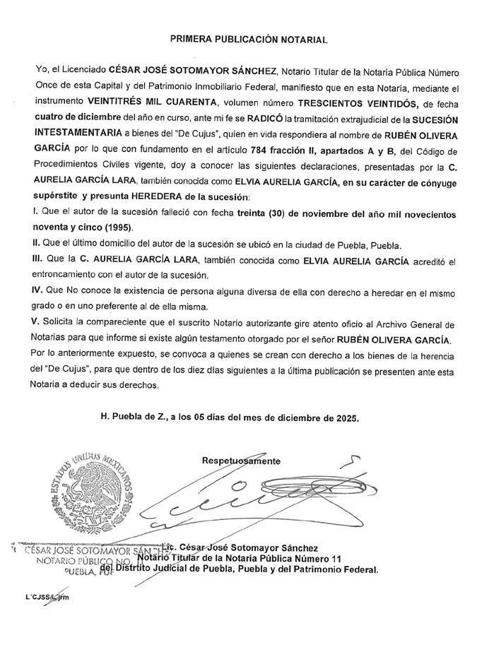 Por instrumento 17,566 del volumen 190 de fecha veinte de noviembre del año dos mil veinticinco, ante mí, compareció la señora MARÍA IRMA HURTADO SERRANO, como Única y Universal Heredera y en su carácter de Albacea Testamentaria para iniciar el procedimiento Sucesorio Testamentario a bienes del señor JOSÉ ALFREDO SOLANO SUAREZ, quien falleció el día trece de octubre de dos mil veinticinco, en la Ciudad de Atlixco, Puebla, manifestando lo siguiente: a).- Que RECONOCE la validez del Testamento Público Abierto, otorgado por el señor JOSÉ ALFREDO SOLANO SUAREZ, en el instrumento número once mil ochocientos noventa y seis, del volumen ciento treinta y dos, de fecha once de diciembre de dos mil dieciocho, otorgado ante la fe de la suscrita Notario. b).- Que -ACEPTA- la herencia instituida en su favor y reconoce sus derechos hereditarios. c).- Que -ACEPTA- el cargo de ALBACEA TESTAMENTARIA que le fue conferido en el instrumento número once mil ochocientos noventa y seis, del volumen ciento treinta y dos, antes descrito y que procederá a formular el inventario y avalúos de los bienes que constituyen el acervo hereditario. ATLIXCO, PUEBLA, A 12 DE DICIEMBRE DEL AÑO 2025. HILDA SÁNCHEZ VALERIO NOTARIO PUBLICO TITULAR No. 4 DEL DISTRITO JUDICIAL DE ATLIXCO, PUEBLA. C. 4 SUR No. 302, COL. CENTRO, ATLIXCO, PUEBLA.