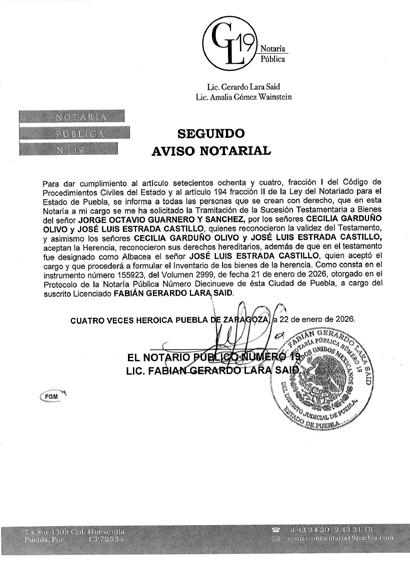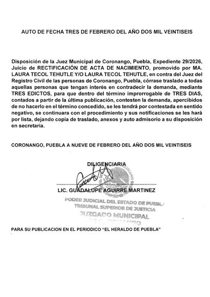 Disposición del Juez Municipal Petlalcingo, Puebla; expediente 35/2026, Juicio Especial de Rectificación de Acta de Nacimiento; BONFILIA CRUZ GARCIA, a efecto de que se asiente correctamente mí nombre: como mi fecha de nacimiento VEINTE DE NOVIEMBRE DE MIL NOVECIENTOS SETENTA Y SIETE. Auto de fecha nueve de febrero dedos mil veintiséis, emplácesele mediante EDICTO a toda persona que pudiera tener interés en contradecir demanda para que comparezca en termino de tres días para hacer valer su derecho, de no hacerlo se tendrá por perdido su derecho, quedando en Secretaria del Juzgado copias de la demanda, anexos y auto de admisión para que se impongan de la misma. Petlalcingo, Puebla; once de febrero de dos mil veintiséis. ABOGADA ERIKA ROSALBA HERNÁNDEZ SARABIA DILIGENCIARIA DEL JUZGADO MUNICIPAL DE PETLALCINGO, PUEBLA.