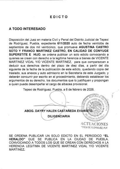 Disposición del Juez Municipal Petlalcingo, Puebla; expediente 38/2026, Juicio Especial de Rectificación de Acta de Nacimiento; CASTULO PEREZ BARRAGAN, a efecto de que se asiente correctamente mí nombre: CASTULO PEREZ BARRAGAN, fecha de nacimiento VEINTICINCO DE ABRIL DE MIL NOVECIENTOS CINCUENTA lugar de nacimiento PETLALCINGO, PUEBLA, nombre de mi padre FELIPE PEREZ CRUZ nombre de mi madre ELOISA BARRAGAN RODRIGUEZ. Auto de fecha nueve de febrero dedos mil veintiséis, emplácesele mediante EDICTO a toda persona que pudiera tener interés en contradecir demanda para que comparezca en termino de tres días para hacer valer su derecho, de no hacerlo se tendrá por perdido su derecho, quedando en Secretaria del Juzgado copias de la demanda, anexos y auto de admisión para que se impongan de la misma. Petlalcingo, Puebla; once de febrero de dos mil veintiséis.