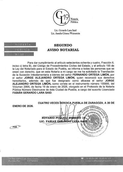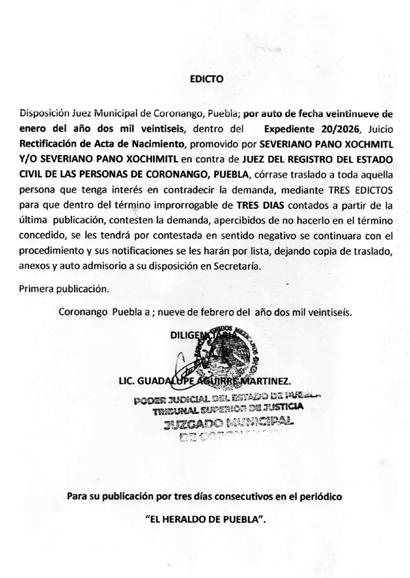EDICTO Disposición del Juez Municipal Petlalcingo, Puebla; expediente 39/2026, Juicio Especial de Rectificación de Acta de Nacimiento; JOSE LUIS PONCE MARQUEZ, a efecto de que se asiente correctamente mí nombre: JOSE LUIS PONCE MARQUEZ, fecha de nacimiento SIETE DE NOVIEMBRE DE MIL NOVECIENTOS OCHENTA Y CUATRO lugar de nacimiento AZCAPOTZALCO, CIUDAD DE MEXICO, nombre de mi madre TERESA PONCE MARQUEZ. Auto de fecha nueve de febrero dedos mil veintiséis, emplácesele mediante EDICTO a toda persona que pudiera tener interés en contradecir demanda para que comparezca en termino de tres días para hacer valer su derecho, de no hacerlo se tendrá por perdido su derecho, quedando en Secretaria del Juzgado copias de la demanda, anexos y auto de admisión para que se impongan de la misma. Petlalcingo, Puebla; once de febrero de dos mil veintiséis.