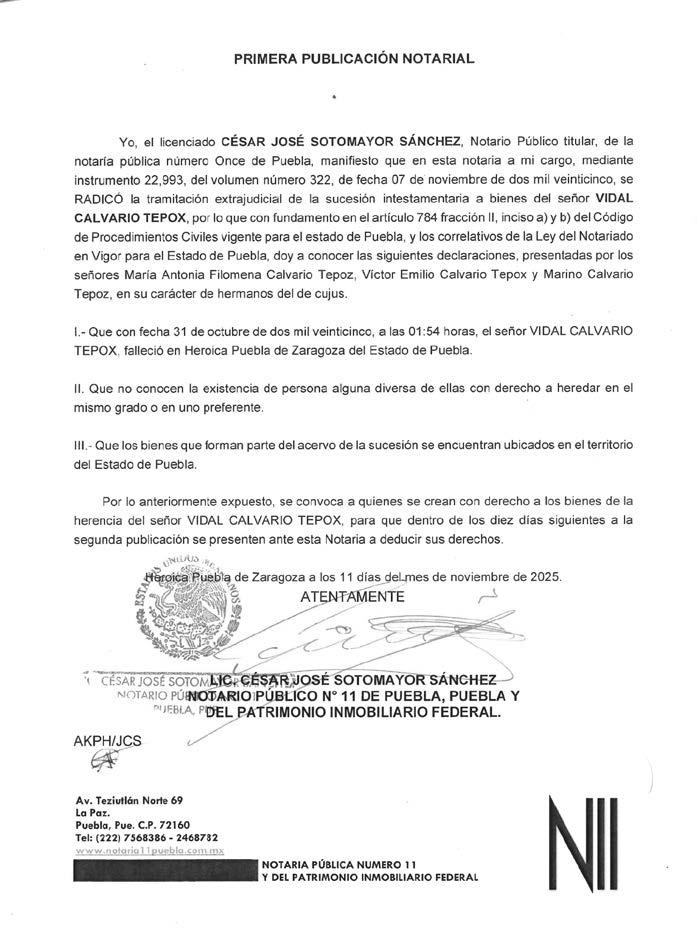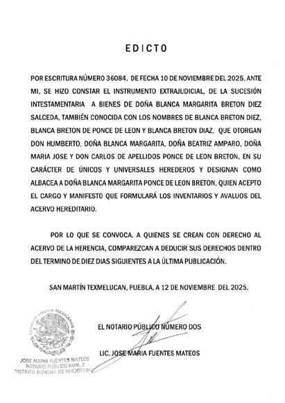 EDICTO DISPOSICION Juez Civil Distrito Judicial Acatlán, Puebla, Resolución de fecha doce de mayo del dos mil veinticinco, se convoca toda persona se crea con derecho a los bienes que corresponden a la presente sucesión, expediente 205/2025, Juicio Sucesorio Intestamentario a bienes de SAMUEL SOSA RAMIREZ, quien tuvo su ultimo domicilio en el Municipio de Tehuitzingo, Puebla, promueve MARIA ANTONIA SOTO HERNANDEZ, NAYELI, MIJAIL ANTONIO, SAMUEL y URIEL, los cuatro de apellidos SOSA SOTO, la primera en su carácter de cónyuge supérstite y los últimos en calidad de descendientes directos en primer grado del autor de la herencia, comparezcan deducir sus derechos a la herencia, termino diez días, a partir día hábil siguiente a esta publicación. Quedando a su disposición en Secretearía, copia de la demanda, sus anexos: un extracto de defuncion, una acta de matrimonio electorinica, dos copias certificadas de acta de nacimeinto, una acta de nacimiento electrónica, una copia certificada de acta de nacimiento, una escritura privada, un instrumento notarial, una copia notariada de cedula profesional, dos avalúos; y del auto admisorio. Acatlán de Osorio, Puebla, a 07 de octubre del 2025. LA DILIGENCIARIA ABOGADA LUCIA ROMAN PEREZ. NOTA: Para su publicación por una sola vez en el periódico "El Heraldo de Puebla".
