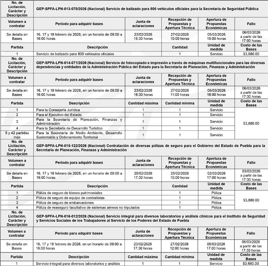 La Secretaría de Planeación, Finanzas y Administración del Gobierno del Estado de Puebla, a través de la Dirección de Adquisiciones de Bienes y Servicios, en observancia del artículo 134 de la Constitución Política de los Estados Unidos Mexicanos, artículo 108 de la Constitución Política del Estado Libre y Soberano de Puebla; así como los artículos 15 fracción I, 16, 78, 79, 82 segundo párrafo,108 y demás que resulten aplicables de la Ley de Adquisiciones, Arrendamientos y Servicios del Sector Público Estatal y Municipal; artículo 47 de la Ley de Egresos del Estado de Puebla para el ejercicio fiscal 2026, 33 fracción LXXV de la Ley Orgánica de la Administración Pública del Estado de Puebla; y artículos 5 fracción VI, inciso c), 9, 13 fracción III y 68 fracciones II y III del Reglamento Interior de la Secretaría de Planeación, Finanzas y Administración del Gobierno del Estado de Puebla, convoca a los interesados a presentar libremente propuestas solventes en idioma español en sobre cerrado, a las personas físicas o morales, de nacionalidad mexicana, en las licitaciones públicas, cuyas bases contienen los requisitos de participación. Los interesados podrán revisar las bases previamente a su pago, el cual será requisito para participar en las licitaciones, en www.licitaciones.puebla.gob.mx y en la Dirección de Adquisiciones de Bienes y Servicios, en el tiempo establecido en los procedimientos.