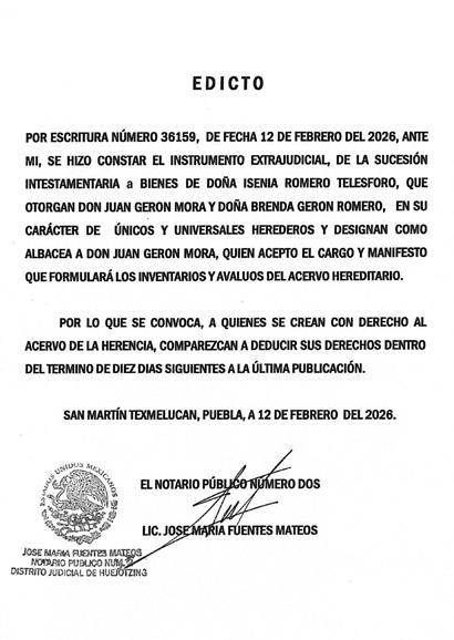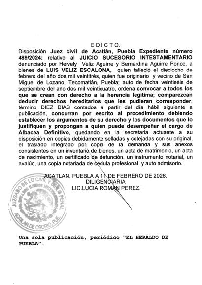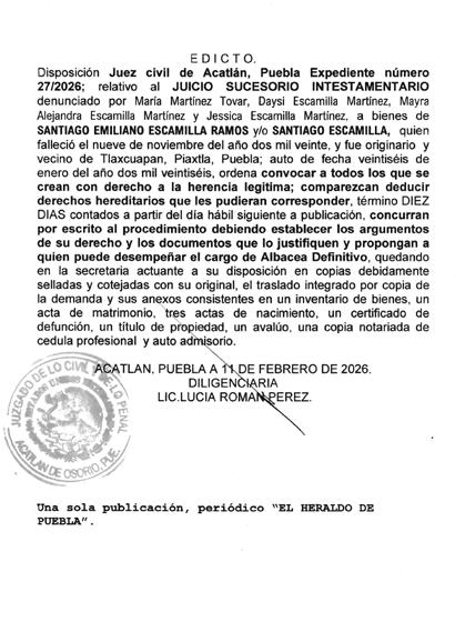 DISPOSICIÓN DEL JUEZ MUNICIPAL DE PETLALCINGO, PUEBLA; expediente 40/2026, Juicio Especial de Rectificación de Acta de Nacimiento; promueve GILBERTO PROCESO DELGADO GUTIÉRREZ, a efecto de que se asiente correctamente mí nombre: GILBERTO PROCESO DELGADO GUTIÉRREZ, fecha de nacimiento DOS DE JULIO DE MIL NOVECIENTOS CUARENTA Y NUEVE, lugar de nacimiento AXUTLA, PUEBLA; como nombre correcto del padre ARISTEO DELGADO TAPIA, como nombre correcto de mi madre EMERENCIANA GUTIÉRREZ GUTIÉRREZ, NÚMERO DE ACTA 30 TREINTA y COMO VÁLIDA MI ACTA DE NACIMIENTO. Auto de fecha doce de febrero de dos mil veintiséis, emplácesele mediante EDICTO a toda persona que pudiera tener interés en contradecir demanda para que comparezca en termino de tres días para hacer valer su derecho, de no hacerlo se tendrá por perdido su derecho, quedando en Secretaria del Juzgado copias de la demanda, anexos y auto de admisión para que se impongan de la misma. Petlalcingo, Puebla; trece de febrero de dos mil veintiséis.