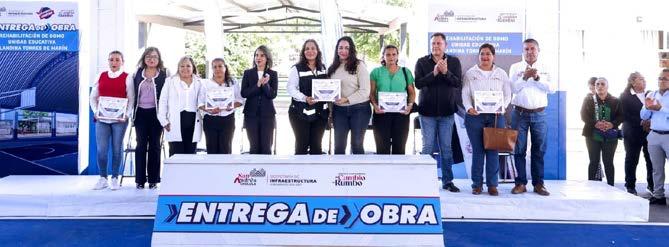 REDACCIÓN. Lupita Cuautle entregó la rehabilitación de la estructura en la cubierta metálica en la primaria Blandina Torres de Marín, en Atlixcáyotl. La obra fortalece actividades escolares, deportivas y comunitarias. FOTO:ESPECIAL