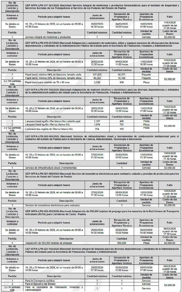 La Secretaría de Planeación, Finanzas y Administración del Gobierno del Estado de Puebla, a través de la Dirección de Adquisiciones de Bienes y Servicios, en observancia del artículo 134 de la Constitución Política de los Estados Unidos Mexicanos, artículo 108 de la Constitución Política del Estado Libre y Soberano de Puebla; así como los artículos 15 fracción I, 16, 78, 79, 82 segundo párrafo,108 y demás que resulten aplicables de la Ley de Adquisiciones, Arrendamientos y Servicios del Sector Público Estatal y Municipal; artículo 47 de la Ley de Egresos del Estado de Puebla para el ejercicio fiscal 2026, 33 fracción LXXV de la Ley Orgánica de la Administración Pública del Estado de Puebla; y artículos 5 fracción VI, inciso c), 9, 13 fracción III y 68 fracciones II y III del Reglamento Interior de la Secretaría de Planeación, Finanzas y Administración del Gobierno del Estado de Puebla, convoca a los interesados a presentar libremente propuestas solventes en idioma español en sobre cerrado, a las personas físicas o morales, de nacionalidad mexicana, en las licitaciones públicas, cuyas bases contienen los requisitos de participación. Los interesados podrán revisar las bases previamente a su pago, el cual será requisito para participar en las licitaciones, en www.licitaciones.puebla.gob.mx y en la Dirección de Adquisiciones de Bienes y Servicios, en el tiempo establecido en los procedimientos.