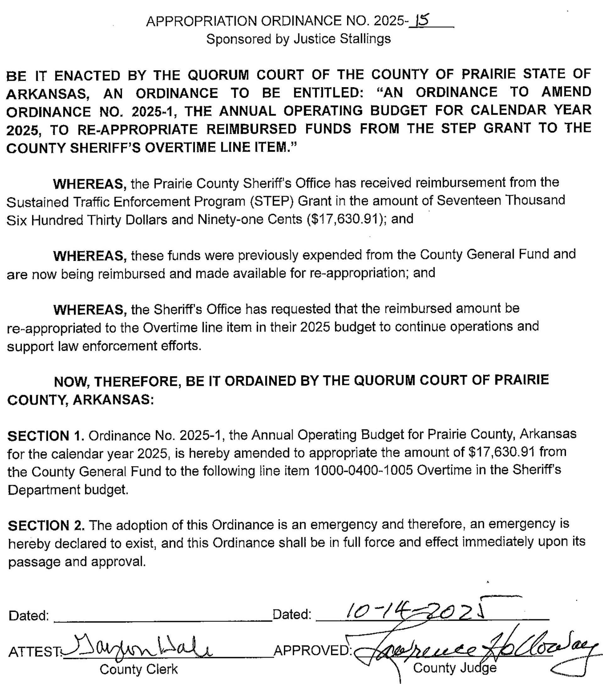 Deputy Sheriff Jeffery Bokker presented information about grant money that the Sheriff’s Department had received, some of which the department has decided to use to pay off two Durango. The approximately $30,000 will be taken from the Communication Fund. Bokker also told the court that the Sustained Traffic Enforcement Program (STEP), which is designed to prevent traffic accidents, will now be fulltime, with $54,000 of overtime pay to be provided by the state. The County has received funds from the STEP Grant in the amount of $17,630.91 which will be used to reimburse the County Sheriff’s overtime account. See Ordinance 2025-15 printed in this