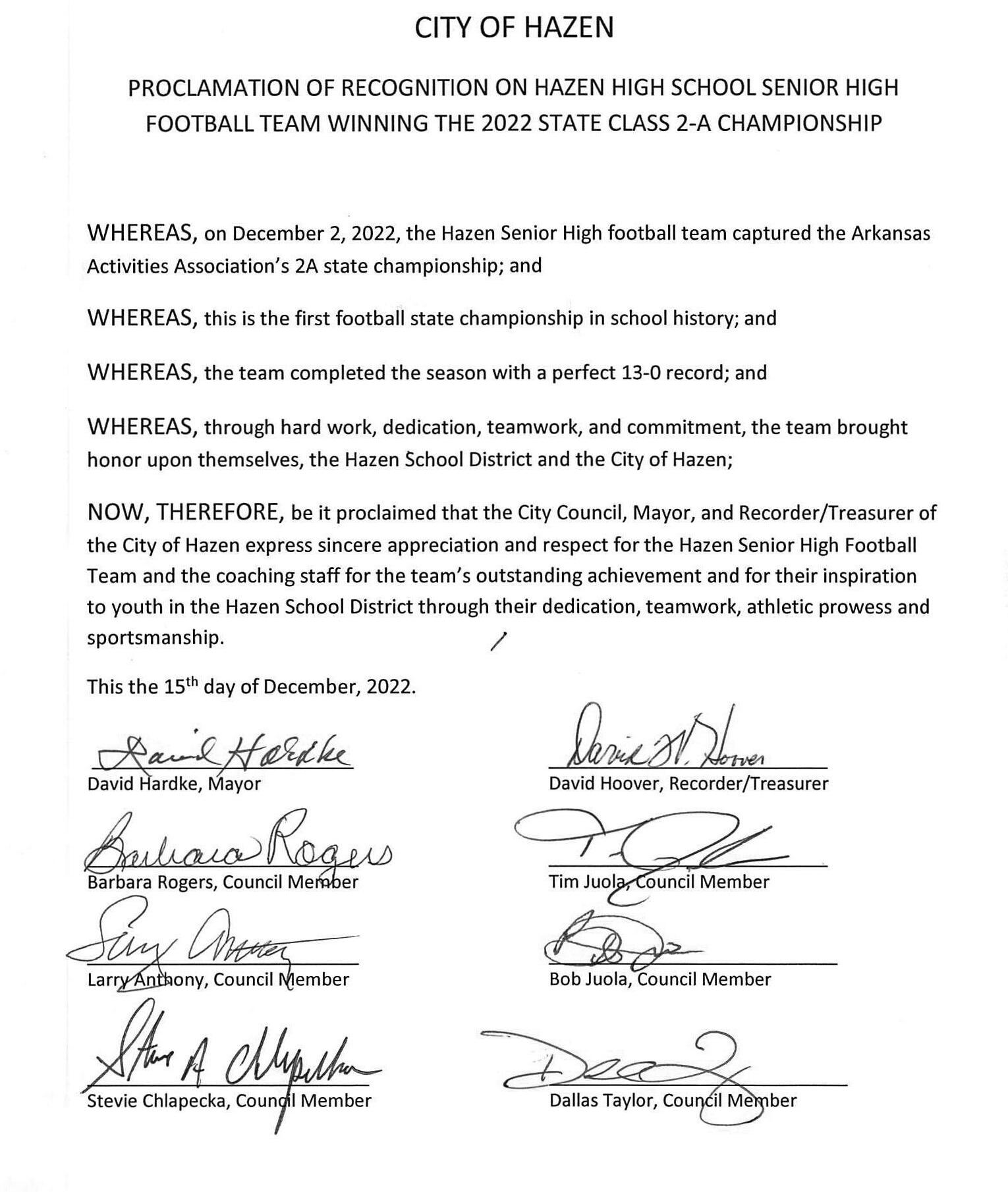 The Hornets went 13-0, beating Carlisle 44-6 to win the Class 2A state championship Dec. 2 at War Memorial Stadium in Little Rock. The title was the first in school history for Hazen.
