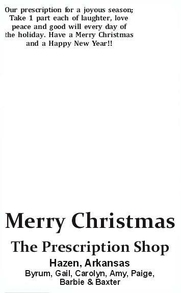 Merry Christmas to all, and to all a good night! Page 8B- The Grand Prairie Herald - Wednesday, December 21, 2022 Merry Christmas and a Happy and Prosperous New Year From Your Friends at the Bank of England 101 Park Street, Carlisle, AR 72024 Phone number: 870-552-7521 https://depositphotos.com/category/professions.htm The staff at Herald Publishing Company Wishes Everyone a Very Merry Christmas, and a Prosperous and Happy New Year!
