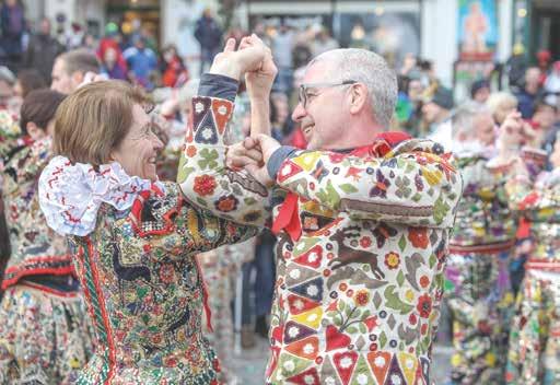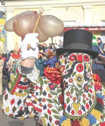 Die Kinder freuen sich und die Flinserl haben jede Menge zu tun, um möglichst allen Gästen dieses schöne Schauspiel zugänglich zu machen. Damit sich auch nur die Kinder um die ausgeworfenen Geschenke der Flinserl bücken, sind die Zacherl mit ihren Saublasen auf der Hut und erinnern jeden Erwachsenen, der sich bückt, mit einem kurzen Schlag auf das Haupt an sein Vergehen –sehr zum Gaudium der Umstehenden. Sind alle fürs Erste versorgt, haben sich die Flinserl einen „Zuakehrer“, also eine Einkehr in ein Wirtshaus, verdient. Bei der KurcaféKonditorei Lewandofsky-Temmel am Kurhausplatz gibt es dann auch den traditionellen Flinserltanz zu bestaunen, bei dem sich die prachtvoll gekleideten Damen und Herren die Ehre geben. Wenn es sich zeitlich ausgeht, gesellen sich auch die Arbeitertrommelweiber hinzu. Dann wird