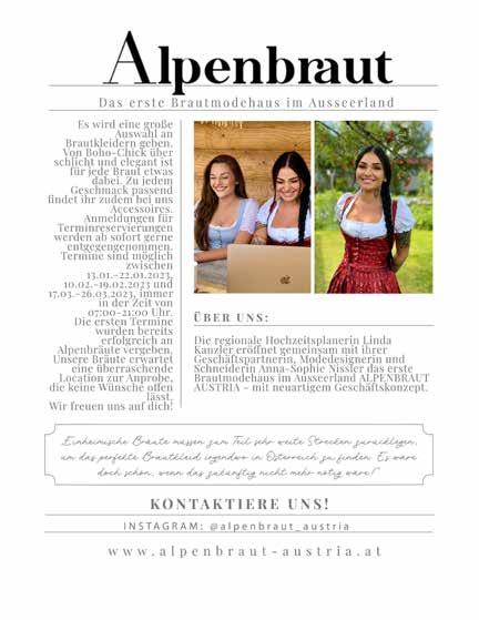 Linda Kanzler ihren Verantwortungsbereich. Selbst bei der Frage nach dem perfekten Kleid kann sie Abhilfe schaffen. Im Jänner 2023 eröffnet sie mit ihrer Geschäftspartnerin & Schneidermeisterin Anna-Sophie Nissler das erste Brautmodengeschäft in Bad Aussee, Alpenbraut Austria.