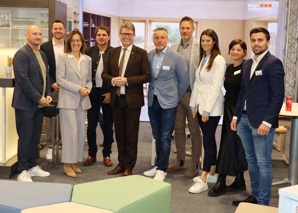 Der Bundesminister für Bildung, Wissenschaft und Forschung, Martin Polaschek (5. v. l.), stattete bei der Interpädagogica dem Messestand von Mayr Schulmöbel einen Besuch ab.