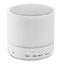 2.1 wireless speaker with LED light indication in ABS. 3 colours changing light. 1 Rechargeable Lithium 450 mAh battery included. Includes a SD card port and an AUX/ USB cable. Hands free call function. Output data: 3W, 4 Ohm. Playing time aprox. 2h. Size Ø6x6 cm Print technique Round screen printing ,P,DO1