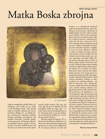 kieszeni co w dzisiejszych ubraniach i gdy ktoś dostał list lub inny ważny drobiazg do przewiezienia, chował go do kaplerzowego woreczka. Tak też postępował żołnierz, który nosił na piersi kaplerz widoczny na zamieszczonym zdjęciu. Często go pewnie z rozkazami posyłano, bo mu się z czasem od tych listów malunek olejny na kaplerzu zaczął wycierać. Oblicze Najświętszej Panienki coraz mniej było wyraźne i wyglądało na to, że może całkowicie zniknąć, a wtedy nie będzie do kogo wieczornych pacierzy zanosić. Postanowił więc żołnierz interweniować póki czas i starym obyczajem wizerunek Matki Bożej srebrną sukienką osłonić. Kiedy na dłuższy popas stanął w kresowym miasteczku, odszukał miejscowego złotnika i kazał mu odpowiednią osłonę malunku wykonać. A że noszony na żołnierskiej piersi obraz narażony był najbardziej na strzały i ciosy wroga, przeto należało taką osłonę wymyślić, żeby odpowiednio chroniła Świętą Osobę. I kazał żołnierz złotnikowi wyklepać w srebrnej blasze nie ozdobną sukienkę − jak było to w zwyczaju − lecz… zbroję karacenową. Odtąd miała Pani Jasnogórska wraz z Synem należytą ochronę i mogła śmiało stawać w boju, chroniona łuskową zbroicą, tak popularną za czasów króla Jana i jego licznych przewag, wśród których potrzeba wiedeńska do najprzedniejszych się zalicza. Pewno też jeszcze przez długie lata kaplerz naszemu żołnierzowi służył, bo malunek wytarł się ze szczętem i karacena, choć metalowa, zdążyła się powyszczerbiać, nosi też ślady licznych doraźnych napraw. Lecz ta pamiątka dawnych bojów dzielnie dotrwała do naszych czasów i choć Matka Boska na Jasnej Górze ma bezliku wspaniałych sukienek zdobnych złotem i kosztownymi kamieniami, to jednak nasz kaplerz jest chyba jedynym Jej wizerunkiem w zbroję przyodzianym.