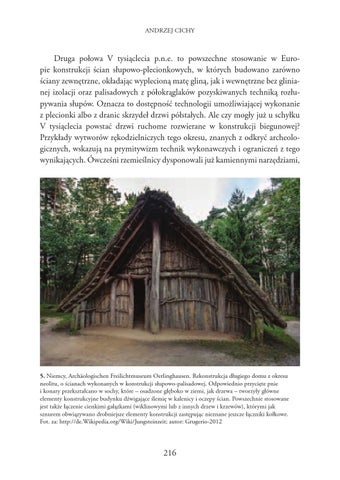 5. Niemcy, Archäologischen Freilichtmuseum Oerlinghausen. Rekonstrukcja długiego domu z okresu neolitu, o ścianach wykonanych w konstrukcji słupowo-palisadowej. Odpowiednio przycięte pnie i konary przekształcano w sochy, które – osadzone głęboko w ziemi, jak drzewa – tworzyły główne elementy konstrukcyjne budynku dźwigające ślemię w kalenicy i oczepy ścian. Powszechnie stosowane jest także łączenie cienkimi gałązkami (wiklinowymi lub z innych drzew i krzewów), którymi jak sznurem obwiązywano drobniejsze elementy konstrukcji zastępując nieznane jeszcze łączniki kołkowe. Fot. za: http://de.Wikipedia.org/Wiki/Jungsteinzeit; autor: Grugerio-2012