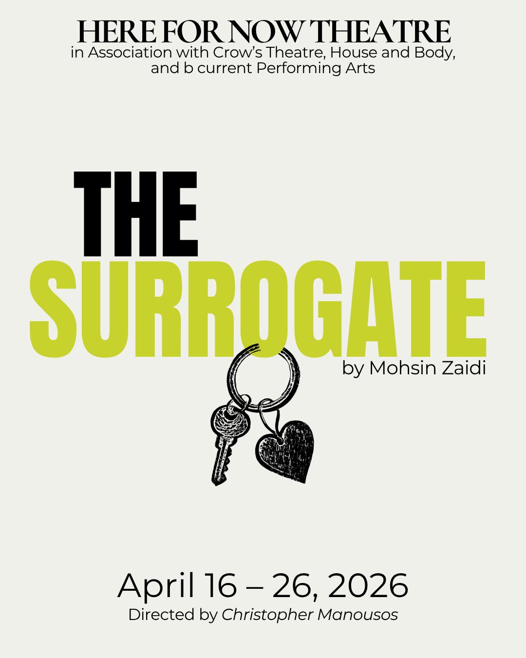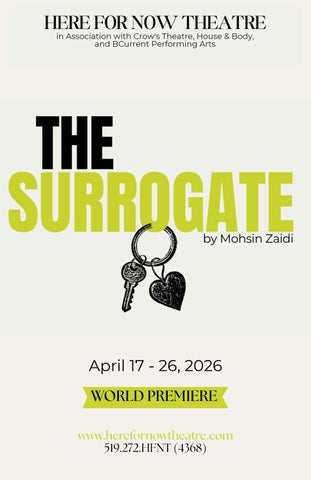 Welcome to The Surrogate, a world premiere by the deeply compelling writer Mohsin Zaidi, directed by Christopher Manousos. We’re thrilled to partner once again with Here for Now, our third collaboration with the Stratford-based company, alongside our friends at BCurrent Performing Arts, and House +Body as part of our 2025.26 season at Crow’s.