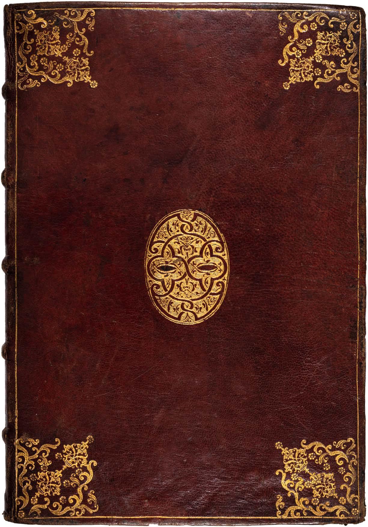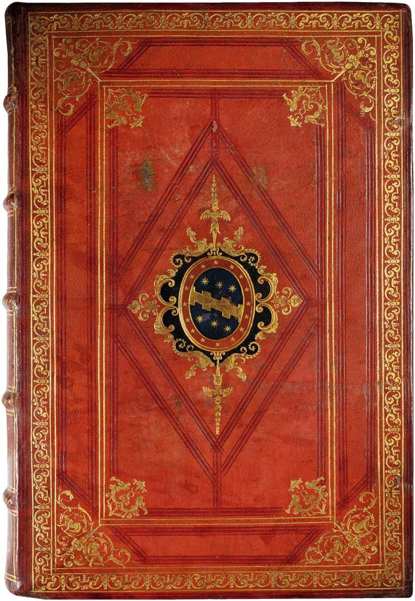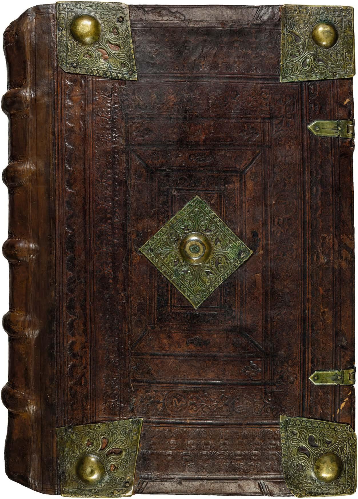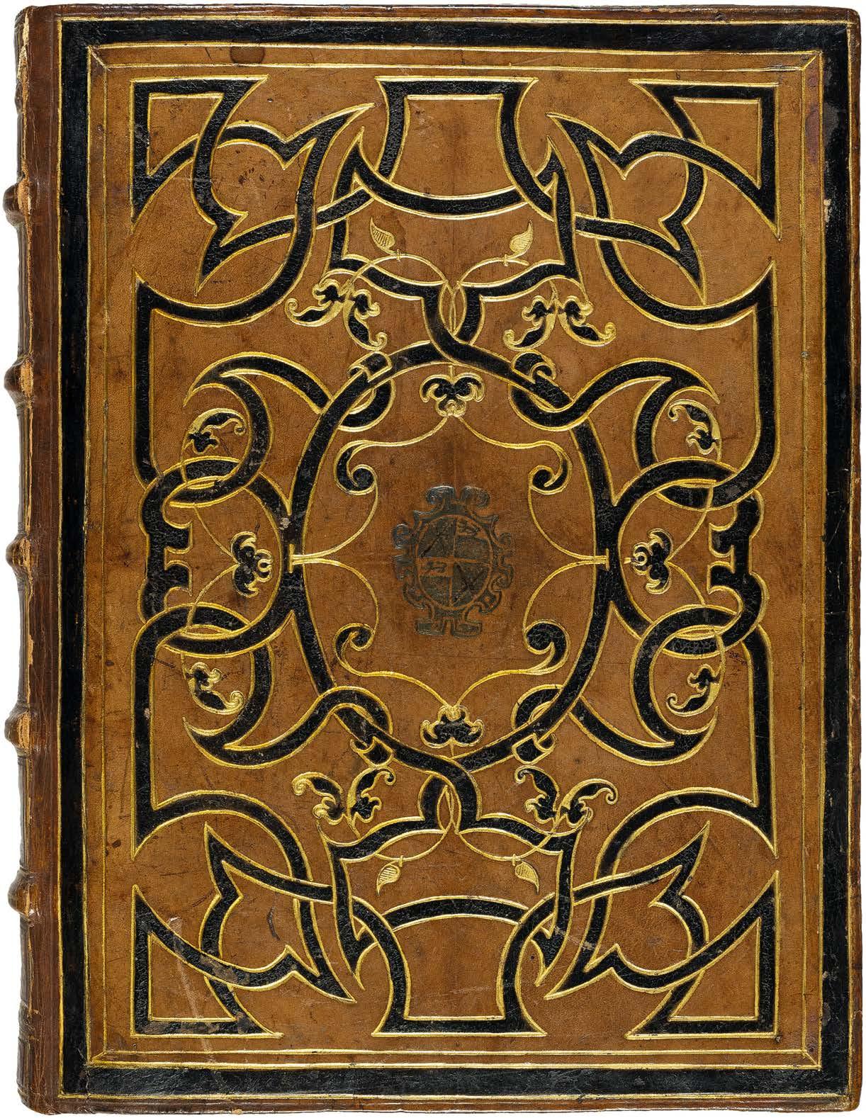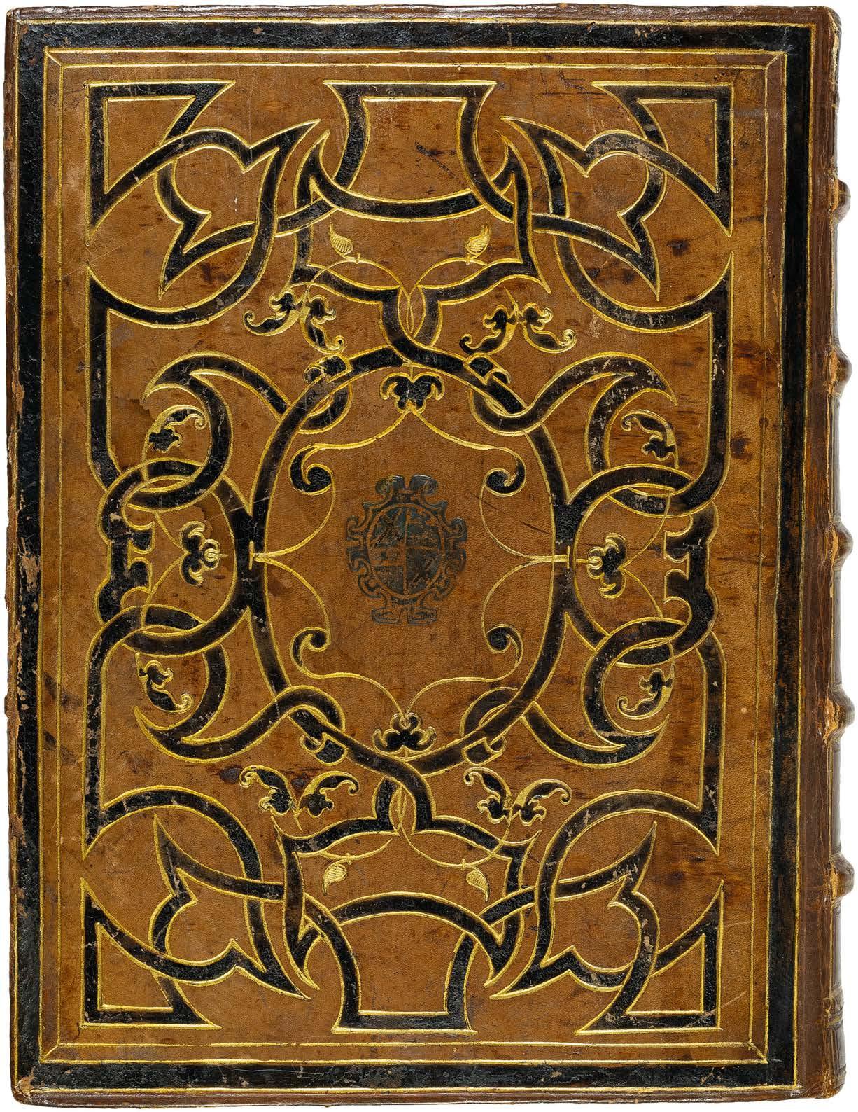 Moderner Pergamentband auf glatten Rücken, mit hellbraunem, goldgeprägtem Rückenschild und blindgeprägtem Rautenwappen auf dem Vorderdeckel, mit zwei Blattweisern aus Pergament, in stabilem, mit Elefantenhaut bezogenem Pappschuber (Titelholzschnitt wie immer, jedoch nur minimal angeschnitten, streckenweise schmaler Nässerand in der unteren Ecke, Register fingerfleckig, sonst so gut wie fleckenfrei; Erclärung: ohne das leere Bl. zu Beginn, Titelbl. am Seitenrand hinterlegt, ebenso das der Declaration).