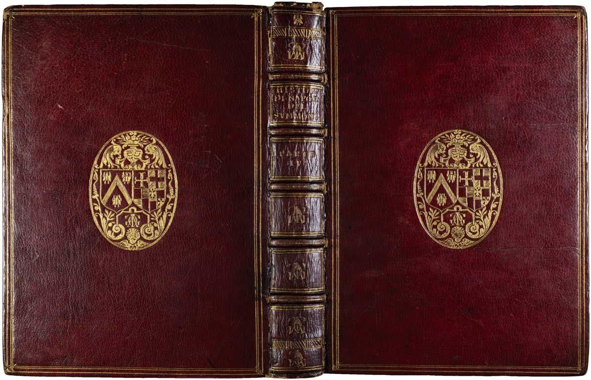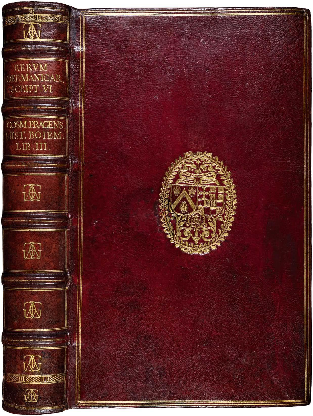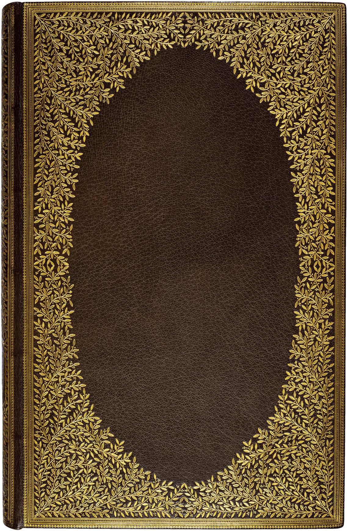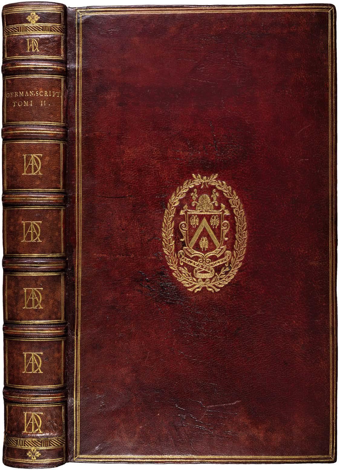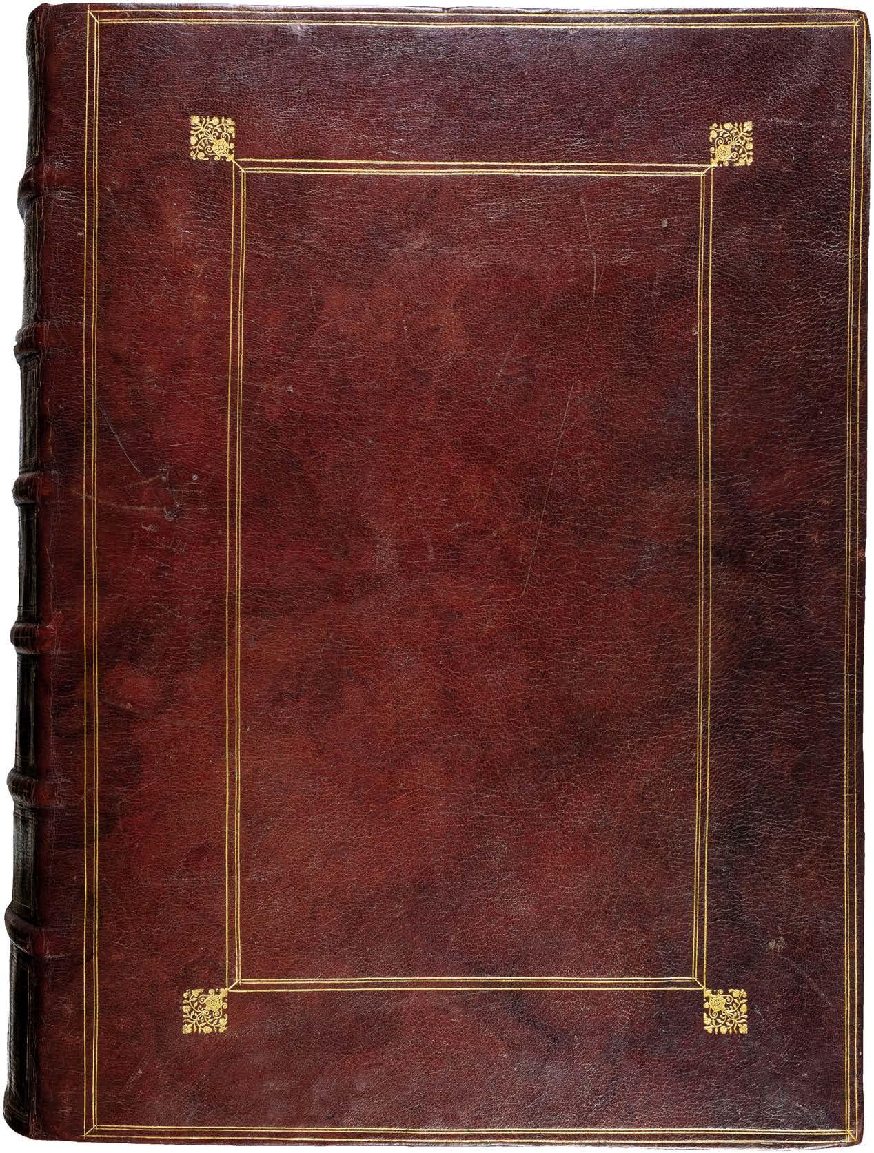 Moderner Pergamentband auf glatten Rücken, mit hellbraunem, goldgeprägtem Rückenschild und blindgeprägtem Rautenwappen auf dem Vorderdeckel, mit zwei Blattweisern aus Pergament, in stabilem, mit Elefantenhaut bezogenem Pappschuber (Titelholzschnitt wie immer, jedoch nur minimal angeschnitten, streckenweise schmaler Nässerand in der unteren Ecke, Register fingerfleckig, sonst so gut wie fleckenfrei; Erclärung: ohne das leere Bl. zu Beginn, Titelbl. am Seitenrand hinterlegt, ebenso das der Declaration).