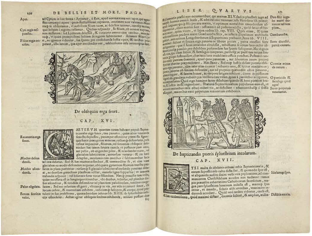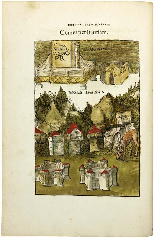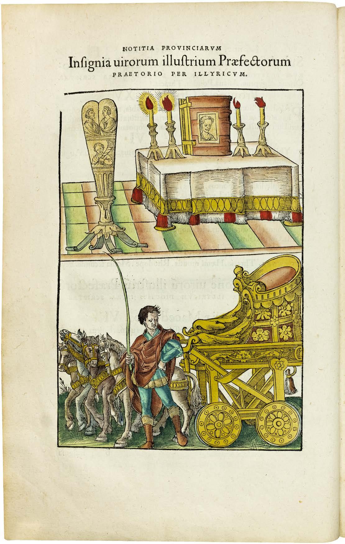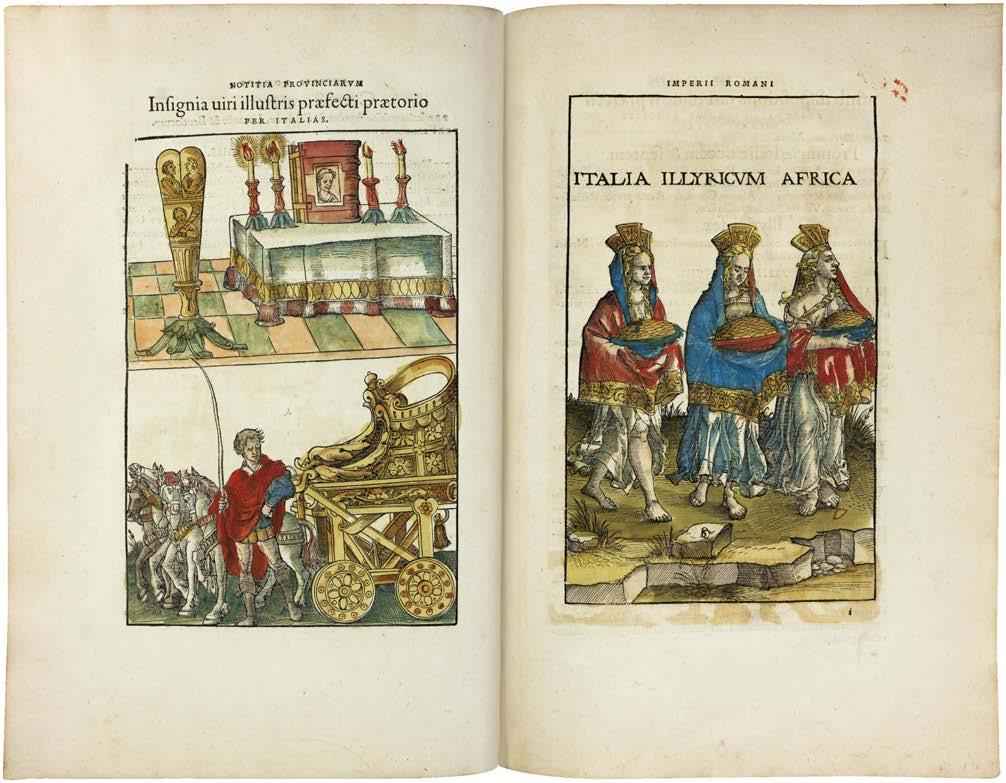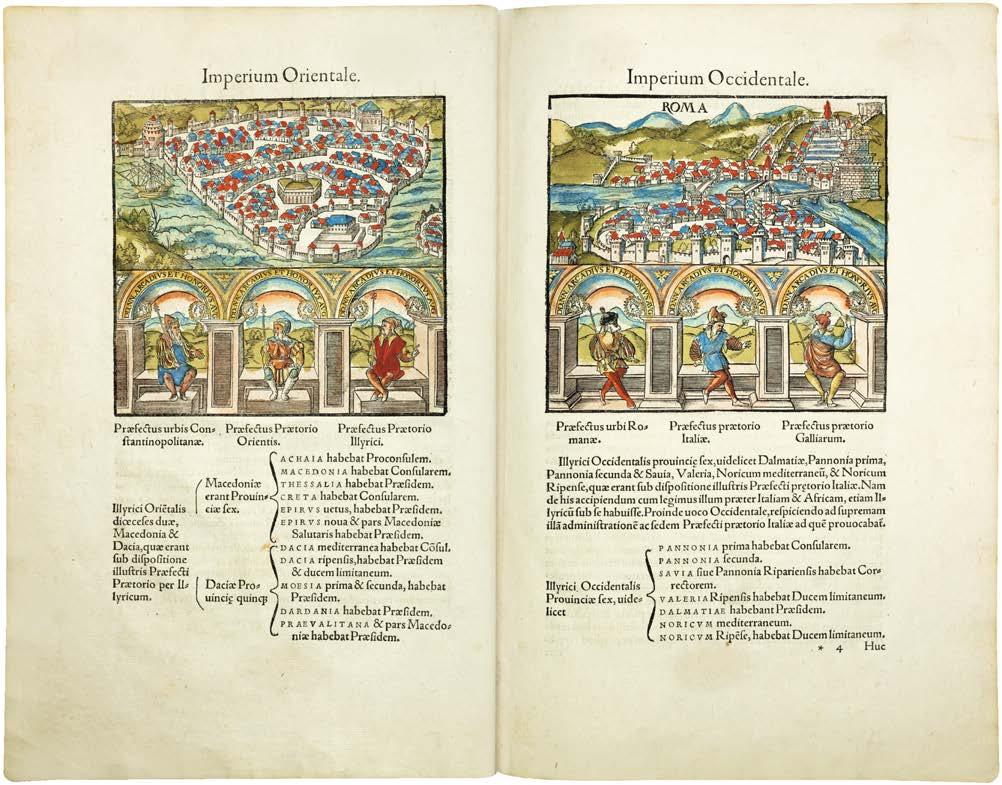 The »Notitia dignitatum« of late antiquity is a richly illustrated list of officials in both halves of the Roman Empire and an important historical source based on a single manuscript lost since the 17th century. The Basel print of 1552, dedicated to Andreas Vesalius, the personal physician of Emperor Charles V, obviously wanted to point out the possibility in principle of a peaceful coexistence of two equal monarchies within the ›one‹ Roman Empire. The more than 100 woodcuts, including some by Hans Rudolf Manuel Deutsch, show beautiful and carefully nuanced colours in both copies, the first being additionally illuminated with gold and heightened with egg white in a most genial way.