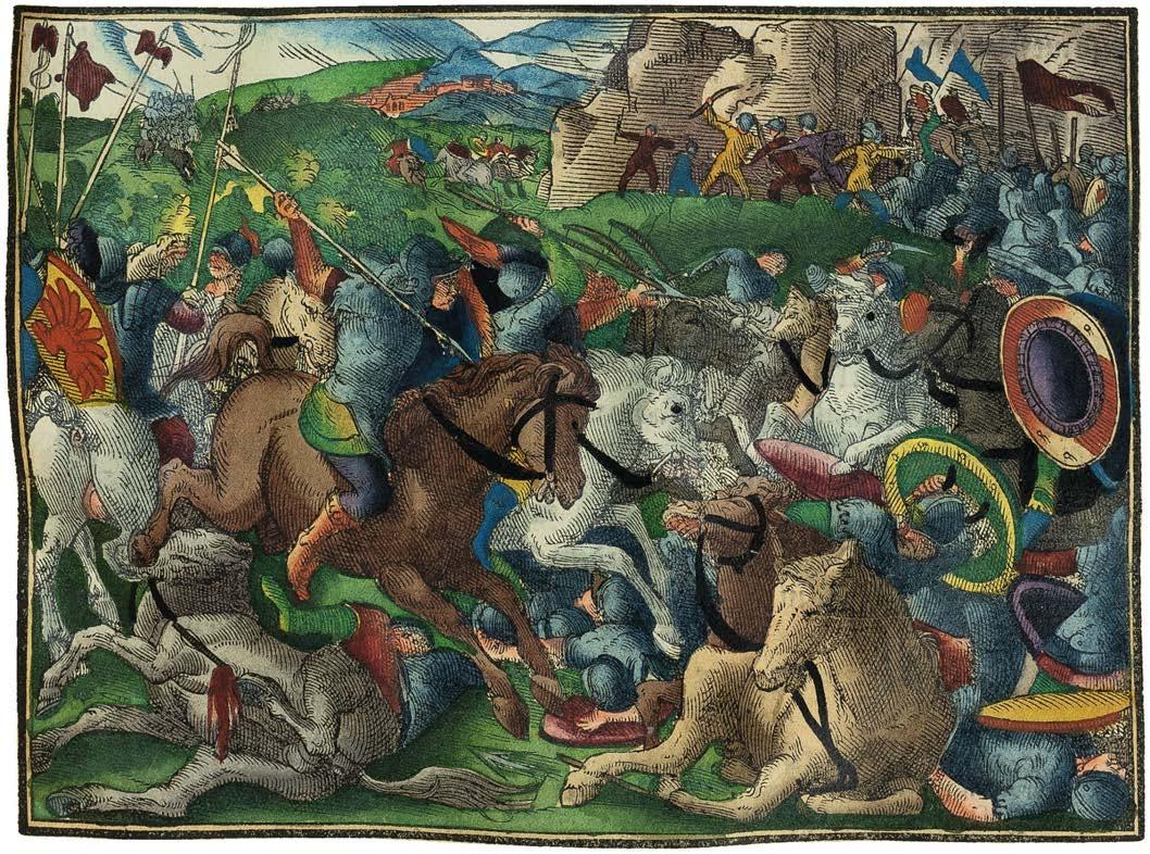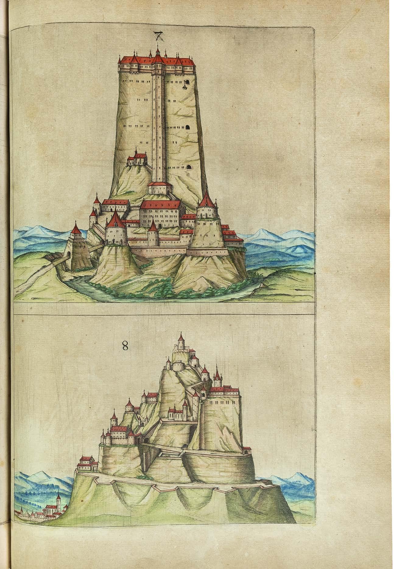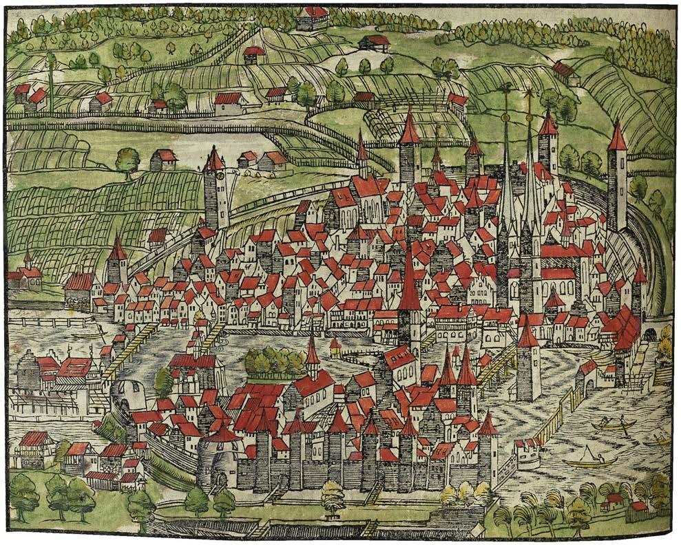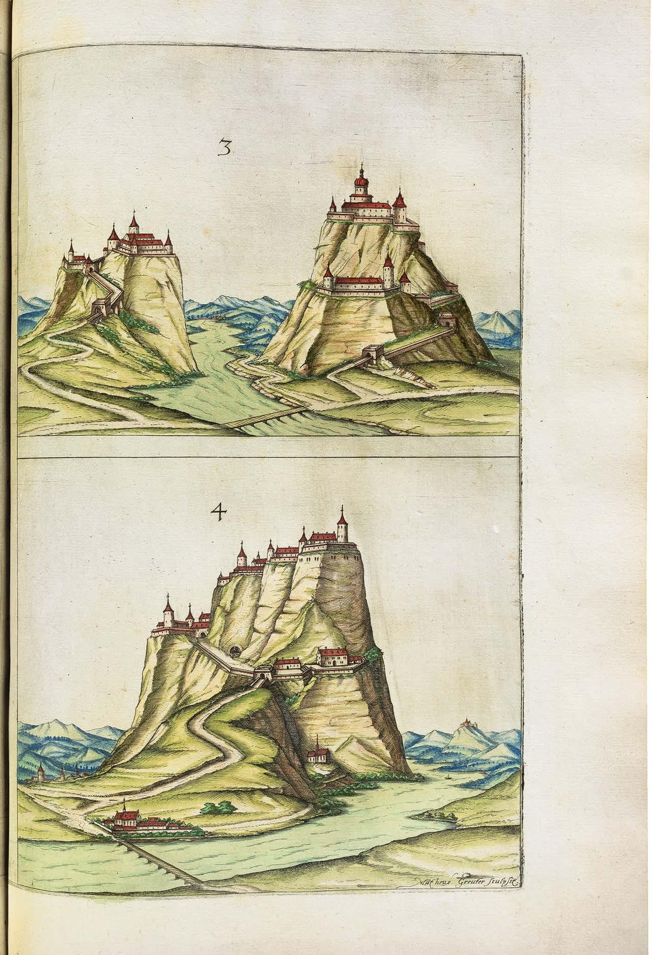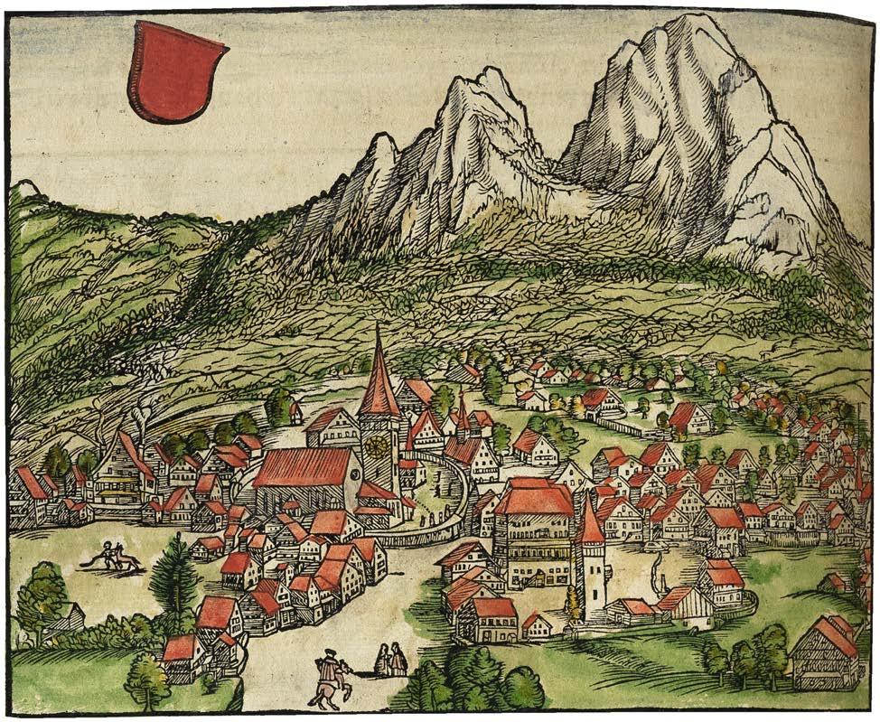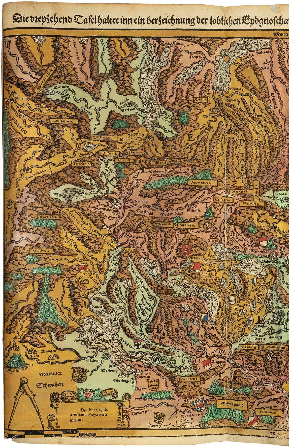 doppel- und ganzseitigen als auch die in den Text eingestreuten. Diese waren dem Auftraggeber wohl besonders wichtig. Im zweiten Teil mit den Beschreibungen der einzelnen Landesteile wurden außer den Karten rund 40 Textillustrationen koloriert, hauptsächlich bedeutendere Orte der Deutschschweiz wie St. Gallen, Zürich, Altdorf, Schwyz, Luzern, Solothurn, Bern, Biel, Basel, auch die »zugewandte« Stadt Mühlhausen im Elsaß. Kein Interesse hatten Maler und Auftraggeber demgegenüber an Graubünden, dem Wallis, der italienischen und der Westschweiz – das in Stumpfs Chronik propagierte gesamtschweizerische Bewußtsein spiegelt sich in der Kolorierung also gerade nicht wider, auch wenn einige Schlachten der Eidgenossen farbig herausgestellt wurden, so die von Laupen [Bl. 257], St. Jakob an der Birs [Bl. 382], Murten [Bl. 265] und im Schwaderloh bei Konstanz [Bl. 70].