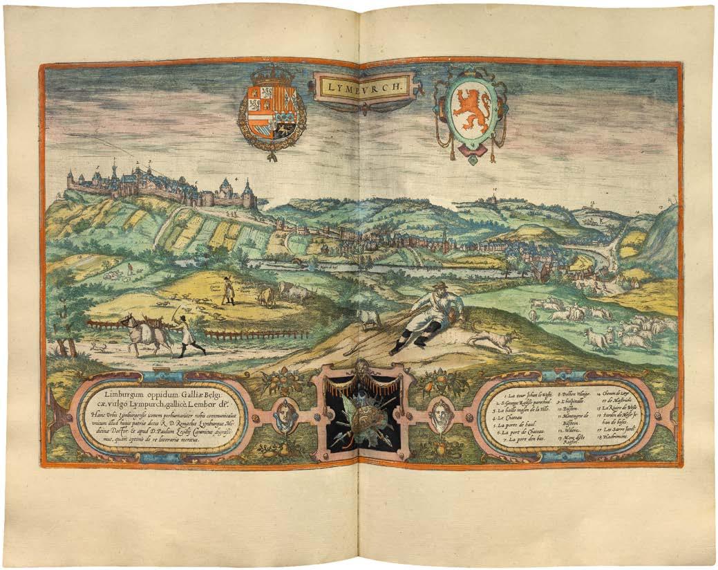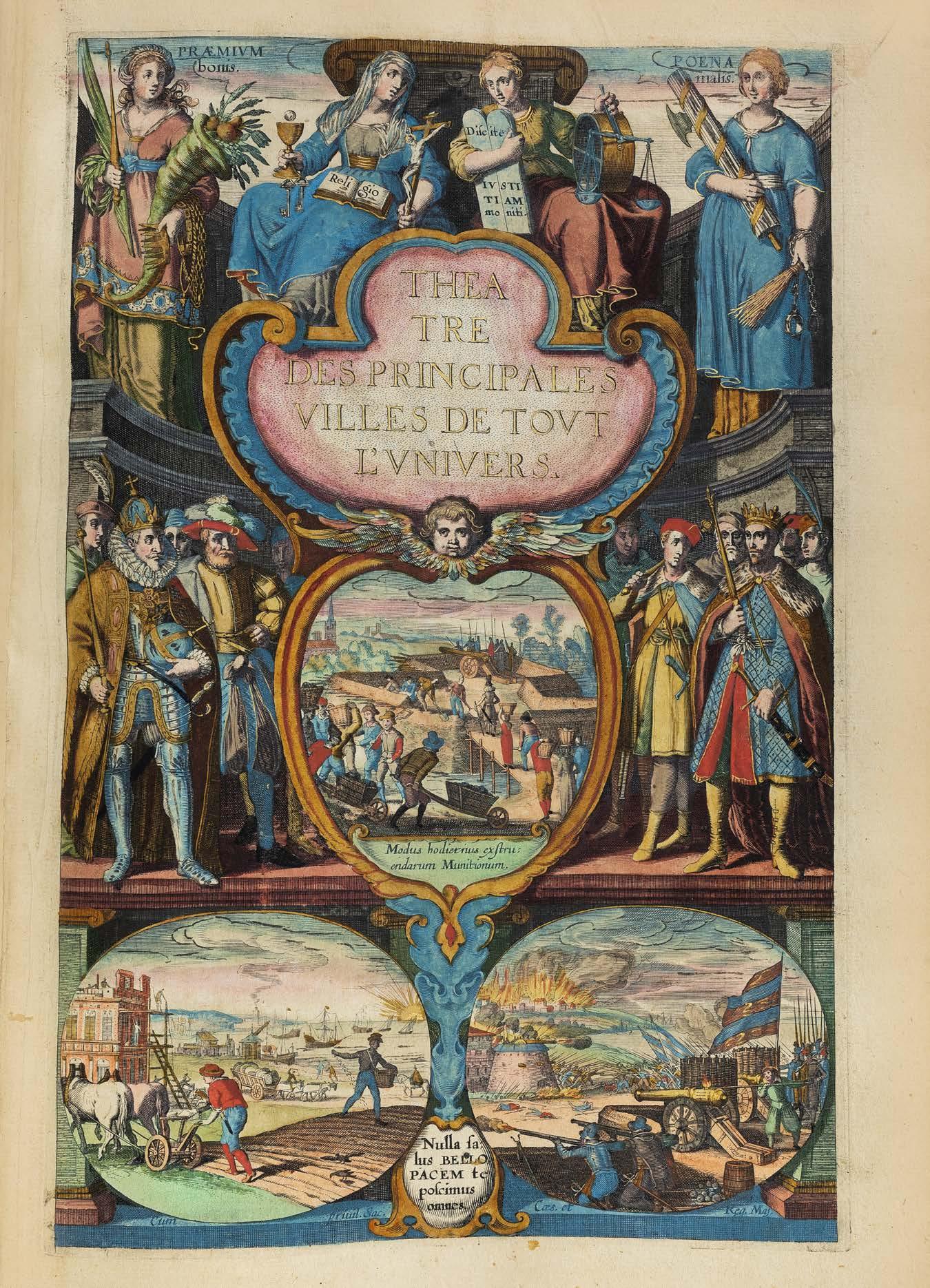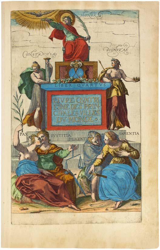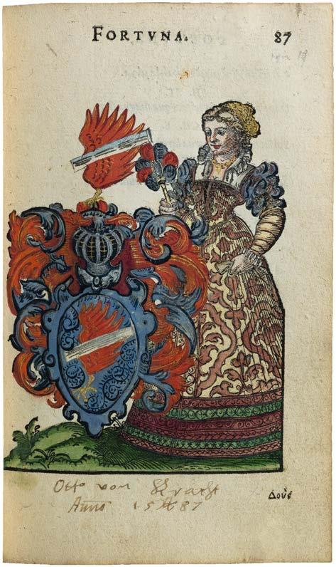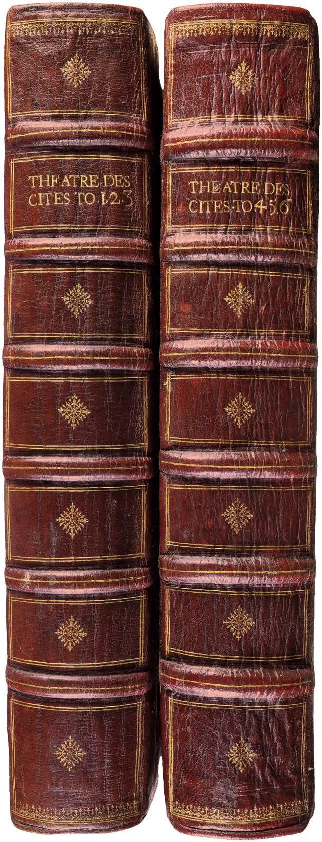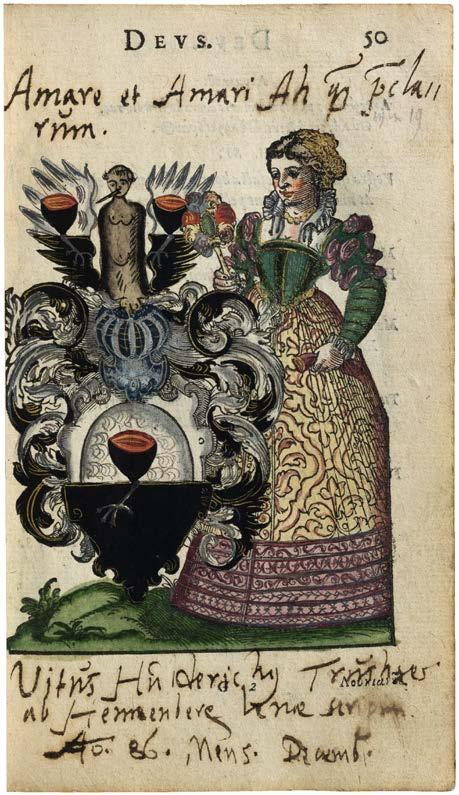 Als Besitzer unseres ersten Exemplars in schönstem Kolorit hat sich auf dem Titel ein »P. de Merenborch« eingetragen: Das könnte der 1631 verstorbene Utrechter Bürger Pieter van Merenborch sein, dessen Wappenbild auf Saenredams Gemälde der Jakobskirche von Utrecht (in der Alten Pinakothek München) zu sehen ist [vgl. Helmus 210ff.]. Diese Provenienz leuchtet unmittelbar ein, nicht nur, weil schon die Widmung an einen Niederländer gerichtet war: Vielmehr mußten die staatsrechtlichen Grundlagen des ›Römischen Reichs‹ für die Niederländer während des gesamten Achtzigjährigen Kriegs bis zur endgültigen Anerkennung ihrer Unabhängigkeit 1648 von brennendem Interesse sein. Das zweite Exemplar hat auf der Titelrückseite ein prachtvoll eingemaltes Wappen, das dem Münzmeister zu Dijon Jean Prévot gehörte, auf dem Titel einen Besitzvermerk des 19.Jahrhunderts. Das Kolorit ist hier nicht ganz so brillant wie beim anderen Exemplar, dafür ist der Buchblock fast unbeschnitten und noch anderthalb Zentimeter höher und breiter.