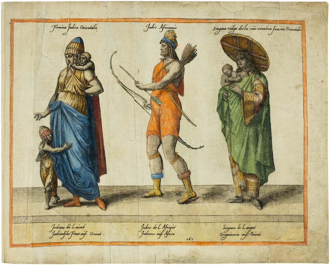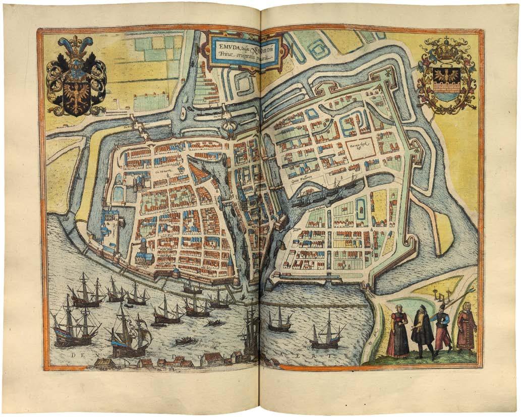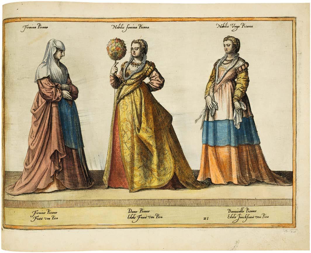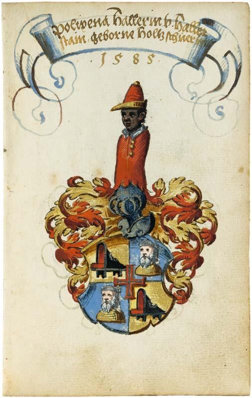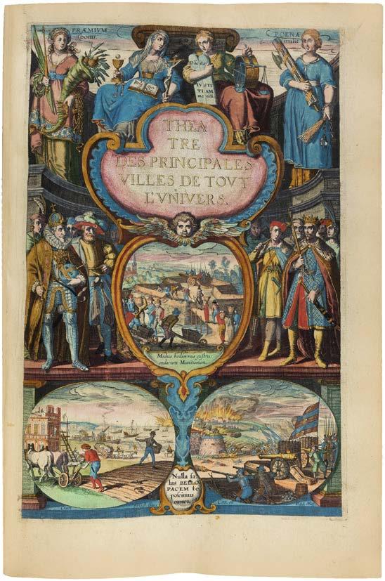 Als Besitzer unseres ersten Exemplars in schönstem Kolorit hat sich auf dem Titel ein »P. de Merenborch« eingetragen: Das könnte der 1631 verstorbene Utrechter Bürger Pieter van Merenborch sein, dessen Wappenbild auf Saenredams Gemälde der Jakobskirche von Utrecht (in der Alten Pinakothek München) zu sehen ist [vgl. Helmus 210ff.]. Diese Provenienz leuchtet unmittelbar ein, nicht nur, weil schon die Widmung an einen Niederländer gerichtet war: Vielmehr mußten die staatsrechtlichen Grundlagen des ›Römischen Reichs‹ für die Niederländer während des gesamten Achtzigjährigen Kriegs bis zur endgültigen Anerkennung ihrer Unabhängigkeit 1648 von brennendem Interesse sein. Das zweite Exemplar hat auf der Titelrückseite ein prachtvoll eingemaltes Wappen, das dem Münzmeister zu Dijon Jean Prévot gehörte, auf dem Titel einen Besitzvermerk des 19.Jahrhunderts. Das Kolorit ist hier nicht ganz so brillant wie beim anderen Exemplar, dafür ist der Buchblock fast unbeschnitten und noch anderthalb Zentimeter höher und breiter.