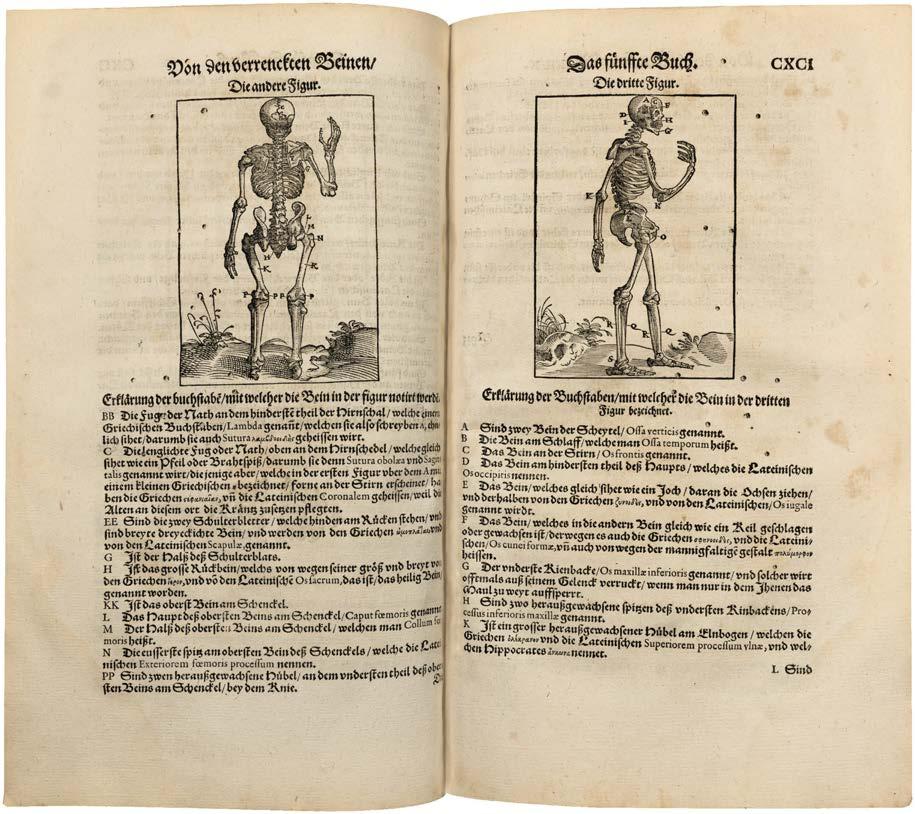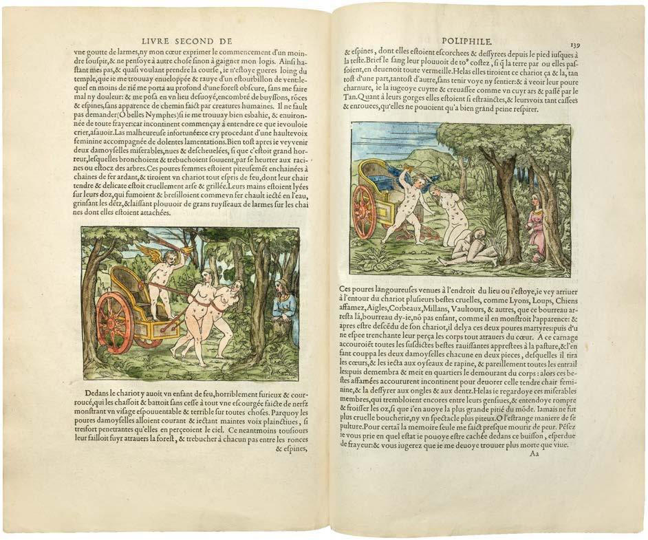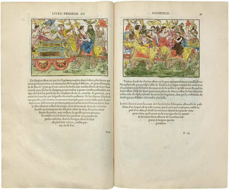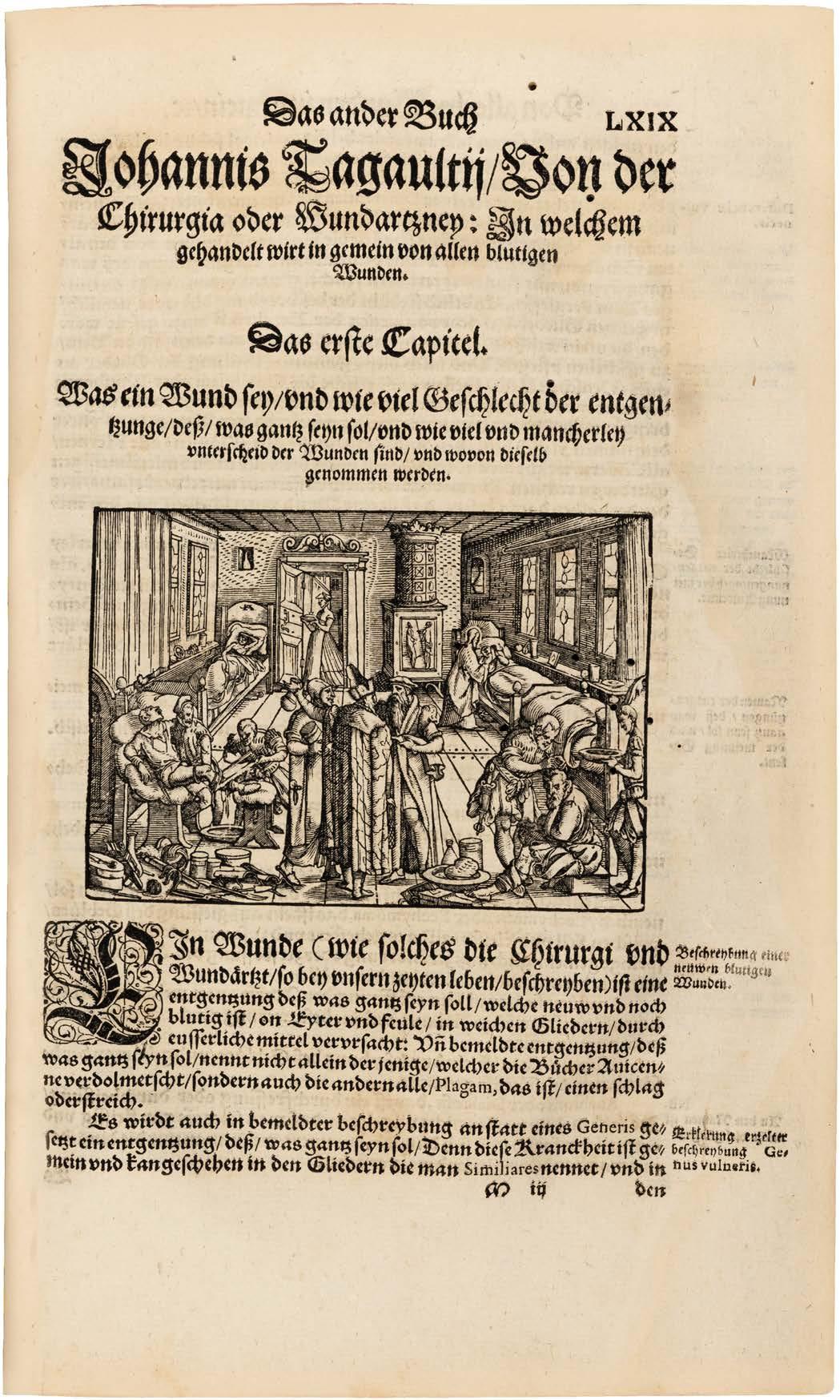 Mit ganzseitigem Titelholzschnitt, einer Bildseite mit 2 Abb., 3 beidseitig bedruckten Falttafeln mit zusammen 10 Abb., sämtlich in Holzschnitt und altkoloriert, außerdem mit sieben elf- bis zwölfzeiligen Holzschnitt-Initialen. – Die angebundenen Titel mit ganz- bzw. halbseitigem, ebenfalls altkoloriertem Titelholzschnitt.