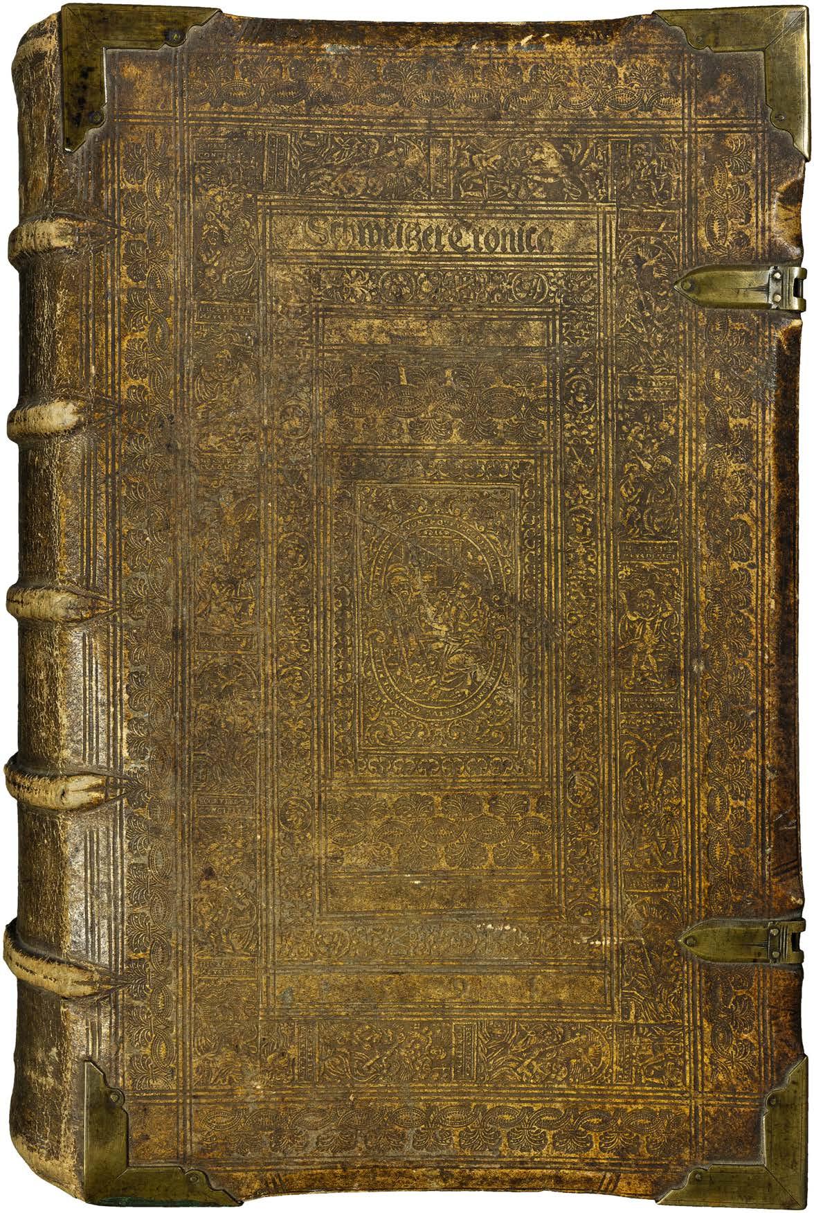 Blindgeprägter Schweinslederband der Zeit über abgeschrägten Holzdeckeln auf fünf mit Fileten versehene Bünde, mit doppelten Filetenrahmen in den Rückenfeldern; die Deckel mit Rahmenwerk aus Streicheisenlinien und Rollenstempeln um zentrale, vorn und hinten unterschiedliche Mittelplatte, vorn darüber »Schweitzer Cronica«, darunter die Jahreszahl »1591« mit 8 Eck- und 3 von 4 Schließbeschlägen aus Messing, mit einigen erhaltenen Blattweisern am Beginn der Bücher (angestaubt und etwas berieben, Schließbänder fehlend, anfangs finger-, durchgehend etwas stockfleckig, letzte Lagen nässerandig, eine Reihe Blätter mit meist modern ausgebesserten Randläsuren, 6 Bl., darunter zwei leere, und die doppelseitige Schweiz-Karte fehlen).