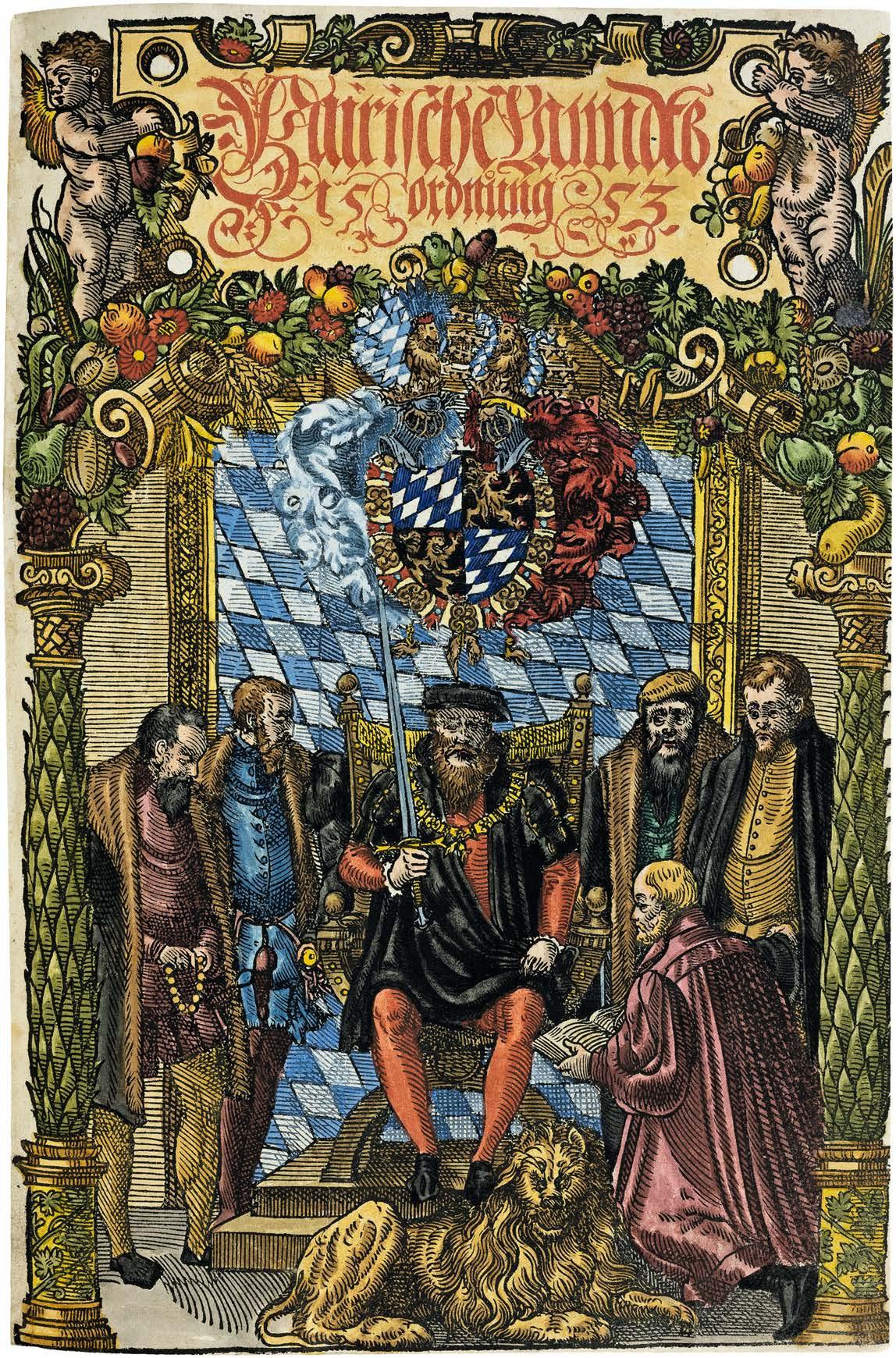 Mit erhobenem Schwert sitzt Herzog Albrecht V. von Bayern (1528 – 1579) vor einem blau-weiß gerauteten Ehrentuch auf dem Thron, ihm zu Füßen ruht friedlich, aber wachsam der bayerische Löwe, während ihm aus dem Kreis seiner Räte einer die Bairische Lanndtsordnung 1553 überreicht – der vielfarbig kolorierte Holzschnitt leitet zugleich das Werk ein, das das erste bayerische Landrecht von 1516 neu und detaillierter faßte und das in Teilen bis heute gültig ist. Seit dem Landshuter Erbfolgekrieg, den Bauernunruhen und Reformationsbestrebungen hatte Bayern unruhige Zeiten gesehen. Als Albrecht 1550 auf den Thron gelangte, war das Land »in keinem guten Zustand: die Finanzen erschöpft, die Verwaltung mangelhaft, das Volk und vor allem die Geistlichkeit verwildert«; mit ihm »begann eine aufbauende Tätigkeit, die sich zielbewußt bis zu seinem Tode fortsetzte« [ NDB 1, 158] und für die das Gesetzeswerk eine wichtige Grundlage bildete.