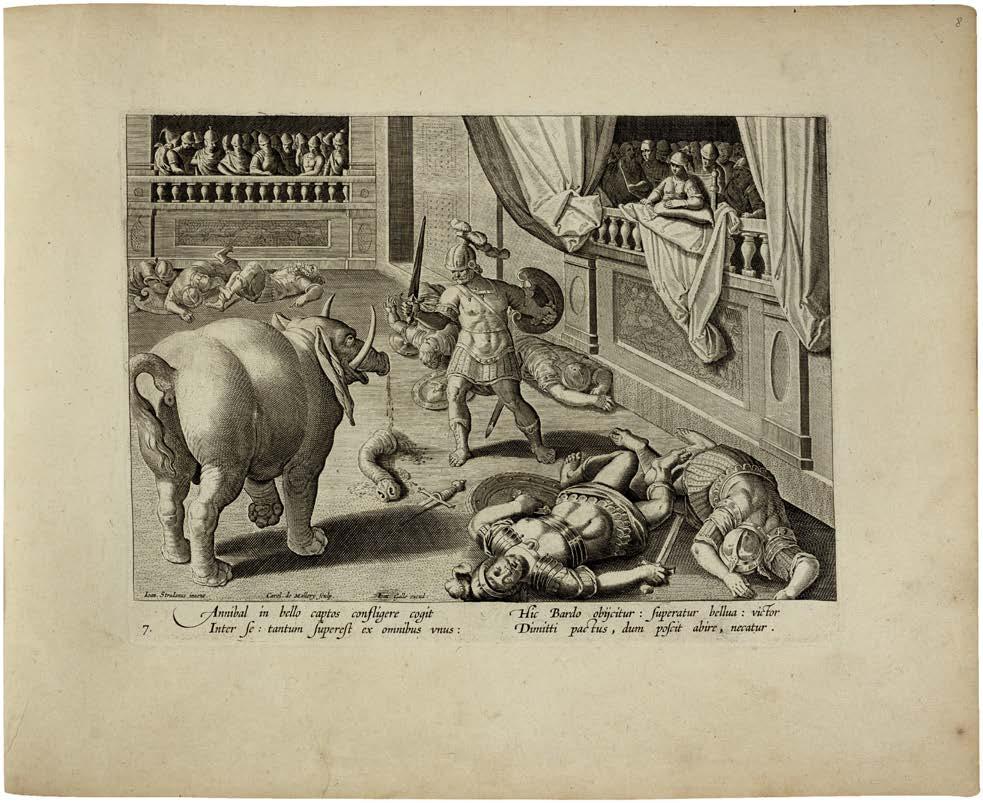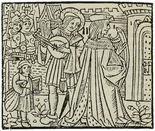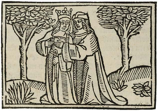 Zusammen mit der Notitia dignitatum überliefert wurde die sich auch hier anschließende, vermutlich ebenfalls um 420/425 an den Kaiser gerichtete anonyme Petitionsschrift De rebus bellicis [Bl. q1-r3], eigentlich »eine aufschlussreiche sozialreformerische Schrift über den Zustand des Reichs« [Hieronymus], ausgestattet mit Illustrationen von Streitwagen, Schiffen und Kriegsmaschinen, die in ihrer sachlich-knappen Umrißhaftigkeit wohl nur noch zum Teil Conrad Schnitt zuzuschreiben sind [vgl. ebd.]. Abgeschlossen wird das Werk von der Philo Alexandrinus zugeschriebenen Altercatio Adriani Aug. & Epicteti philosophi [r4r-r5r]. Darin stellt Kaiser Hadrian dem stoischen Philosophen zahlreiche »Was ist?«-Fragen über Gott und die Welt, die dieser ganz im Sinne humanistischer Mäßigkeitsideale beantwortet: »Quid est victoria?« – »Belli discordia, Pacis amor«. »Quid est pax?« – Tranquilla libertas«. Zur Zeit der Vorbereitung unseres Drucks war Epiktet fast ein ›Modephilosoph‹, war selbst aber von zwei Kaisern sehr unterschiedlich behandelt worden: Domitian ließ ihn mit anderen Philosophen aus Italien ausweisen, worauf er nach Nikopolis in Epirus ging. Hadrian trat mit ihm hingegen in eine persönliche Beziehung. Der ganzseitige Schlußholzschnitt, der Herrscher und Philosoph in angeregtem Disput zeigt, ist somit auch ein Plädoyer in eigener Sache, daß ›der Denker mit dem Kaiser gehen‹ möge – und umgekehrt.