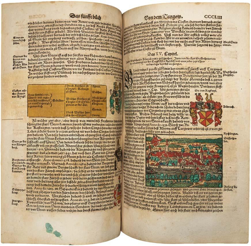 Dieses Exemplar der Erstausgabe von Johannes Stumpfs Schweizer Chronik ist teilkoloriert, beide Teile wiederum in unterschiedlicher Weise. Dies ermöglicht interessanterweise recht konkrete Mutmaßungen über die frühe Provenienz.
