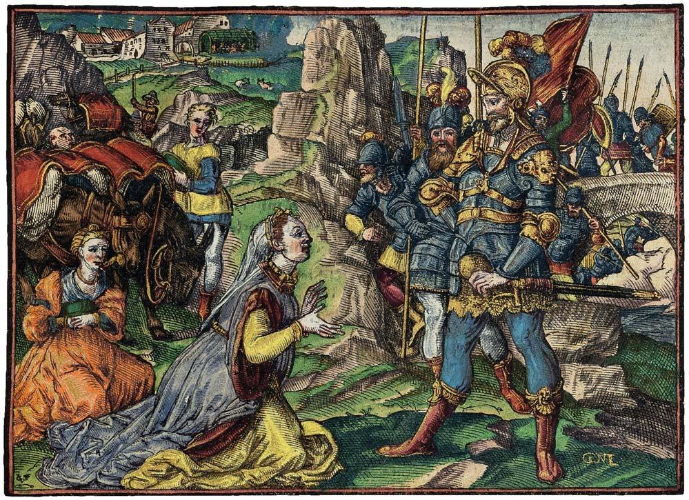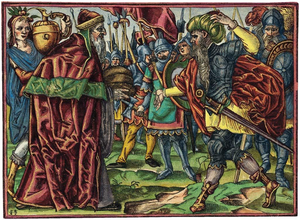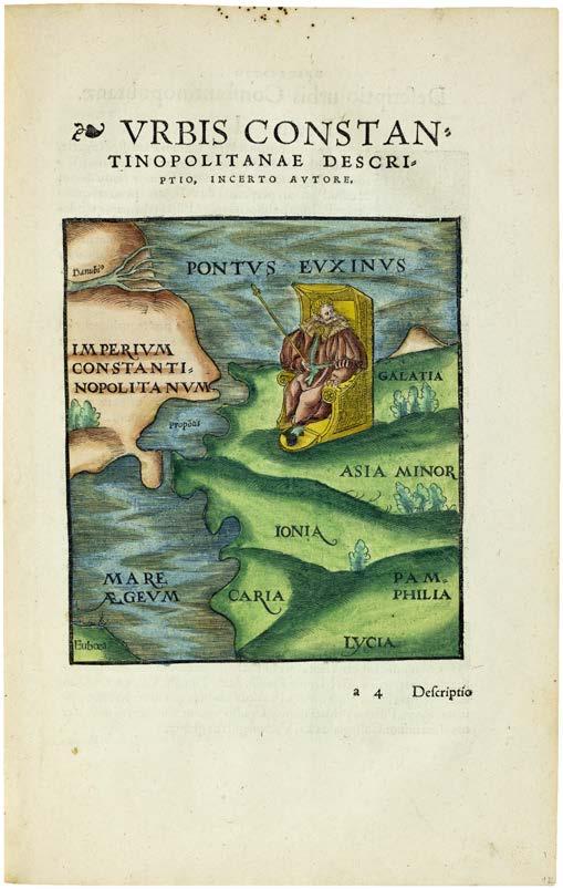 Vielsagend sind auch die ersten vier Abbildungen, von denen drei nicht aus dem Bildbestand der Notitia stammen, sondern »frühestens 1547« [Hieronymus] wohl von Hans Rudolf Manuel Deutsch (1525 – 1571) geschaffen wurden [vgl. ebd.] Rhenans Beschreibung Illyriens wird illustriert von Ansichten von Rom und Konstantinopel, jeweils über Arkaden, deren Bögen unisono die Doppelherrschaft von »Arcadius [!] et Honorius Aug.« beglaubigen, unter denen jeweils drei Präfekten sitzen. Vor der Beschreibung Roms thront die Personifikation der Stadt unter der Überschrift: »Urbs quae aliquando desolata, nunc gloriosior, piissimo imperio restaurata«, eine Eloge an den Kaiser, vielleicht verbunden mit einer bösen Anspielung an den Sacco di Roma von 1527. Der oströmische Kaiserthron, wiederum von Manuel Deutsch, erscheint hingegen kleiner und steht in Kleinasien, während das »Imperium Constantinopolitanum« – hervorgehoben durch eine abweichende Kolorierung in komplementärer Farbigkeit! – ahistorisch auf die europäische Seite des Propontis beschränkt wird: Landkarte und nach Osten versetzter Thron spielen indirekt auf die osmanische Usurpation Konstantinopels an. Auch die Holzschnitte liefern tendenziell geschönte ›Bilder aus glücklichen Tagen‹!