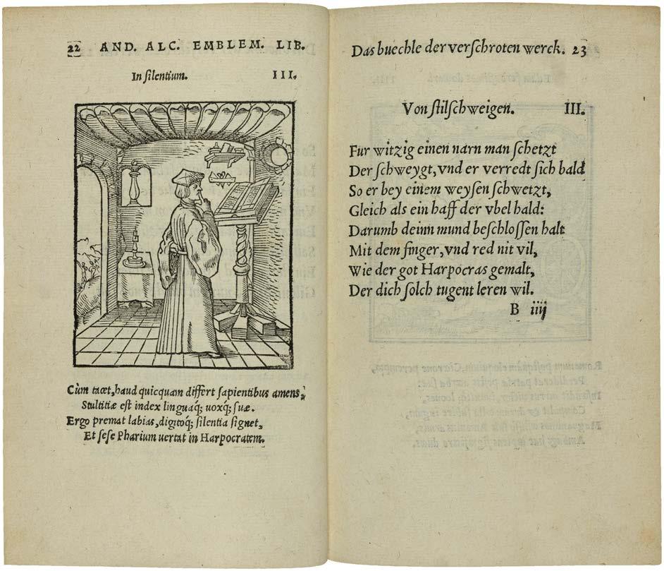 Dann erst schließen sich die beiden Kerntexte der Notitia dignitatum an, deren zahlreiche Illustrationen, vermittelt über den Codex Spirensis des 9. Jahrhunderts, gleichfalls auf die ursprüngliche spätantike Handschrift zurückgehen. Die Umsetzung in den Holzschnitt besorgte um 1536 Conrad Schnitt (1495 – 1541), der Architekturen, Kleider, Waffen, Bücher und Gefäße »in einem spätgotisch-antikisierenden Stil« darstellte, wovon »bezeichnenderweise die zeitgenössisch nicht mehr geläufigen Geräte wie Dreifuss u. ähnl.« [Hieronymus] ausgenommen waren. Die Illustrationen zeigen Insignien der Hof-, Zivil- und Militärbeamten, außerdem die hier teils singulär überlieferten Schildzeichen, personifizierte Darstellungen der einzelnen Diözesen und Provinzen sowie stark stilisierte Ansichten von Städten und Kastellen. Allen Beamten wurde bei ihrem Dienstantritt ein kaiserliches Diplom in Form eines Codex überreicht, bei den höheren Rängen mit deren Porträt auf dem Vorderdeckel. Auf der ersten Seite war emblemhaft dargestellt, womit sie sich im Amt zu beschäftigen hatten [vgl. RAC 25, 1138]. Sowohl diese Codicilli als auch die darin enthaltenen Embleme in Gestalt »ihrer ›Arbeitsgeräte‹« sind abgebildet: »So zeigt das Insigne des comes largitionum Lebensmittel und Gefäße (für Wein) oder das Insigne des primicerius notariorum Schreibgeräte« [ebd. 1137]. Diese Dienstzeichen heben sich sichtlich von den Wappen mittelalterlicher Adliger ab: Ihre Dignität leitet sich noch unmittelbar von ihrer Funktion her, nicht aus der Abstammung – ein weiterer Akzent, der ganz im Sinne des humanistischen ›Beamtenadels‹ sein mußte. Er zielte, wie das Bild vom Körper mit seinen größeren und kleineren Gliedern, auch auf die innere Verfassung des Reiches: auf ein funktionierendes ›Reichsregiment‹ und dessen Instanzen, etwa in den neu eingerichteten Reichskreisen, anstelle von dynastischen Partikularinteressen. Der geradezu ikonische