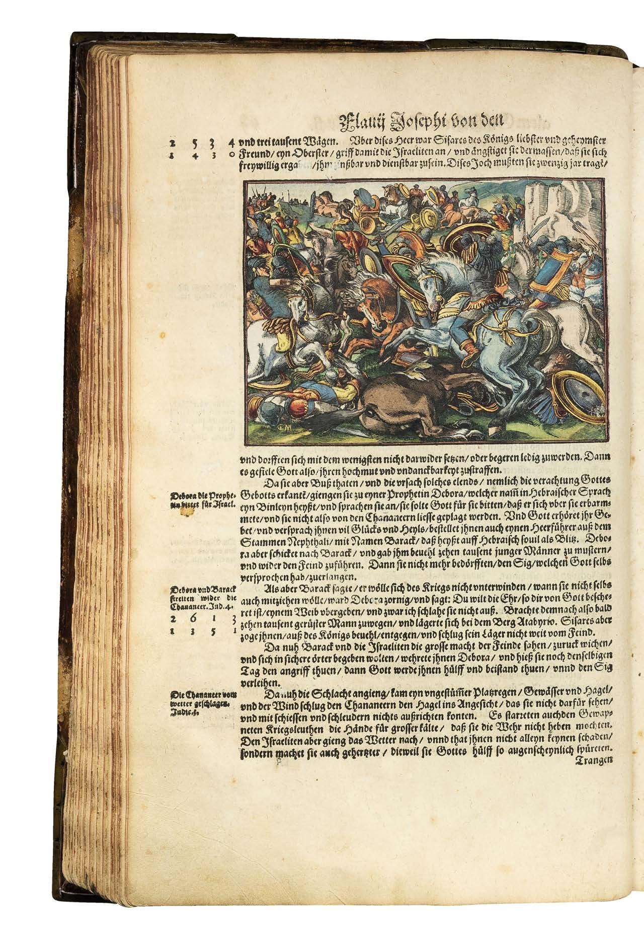 Mit kolorierter Druckermarke auf dem Titel, 22 [statt: 23] kolorierten Karten, davon 8 ganzseitig und 4 [statt: 5] als doppelblattgroße, auf Stegen montierte Tafeln, mit einem ganzseitigen illustrierten und kolorierten Stammbaum der türkischen Kaiser, ca. 3900 Abbildungen (von ca. 2500 Stöcken, darunter über 1900 Wappen), bis Bl. 79 koloriert bzw. ankoloriert, in Teil II rund 40 Stadt- und Schlachtenbilder koloriert, ferner mit einigen Stammtafeln und Zeit-Leisten sowie zahlreichen Schmuckinitialen; alles in Holzschnitt. – Die doppelblattgroße Karte der Eidgenossenschaft fehlt.