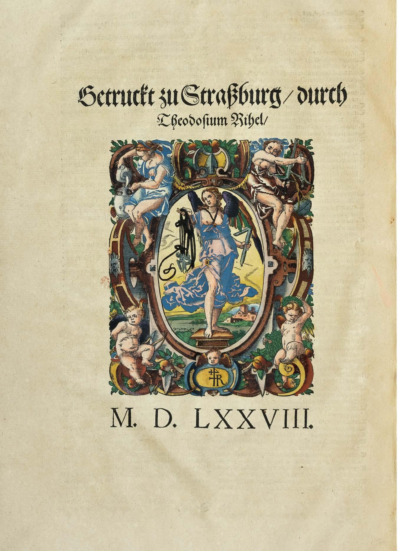 Mit Druckermarke auf der ersten und letzten Seite, 106 oft ganzseitigen Abbildungen sowie zahlreichen Initialen auf Cribléegrund, alles in Holzschnitt und original koloriert.