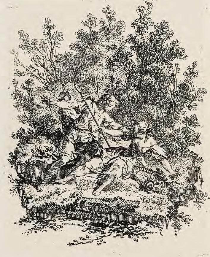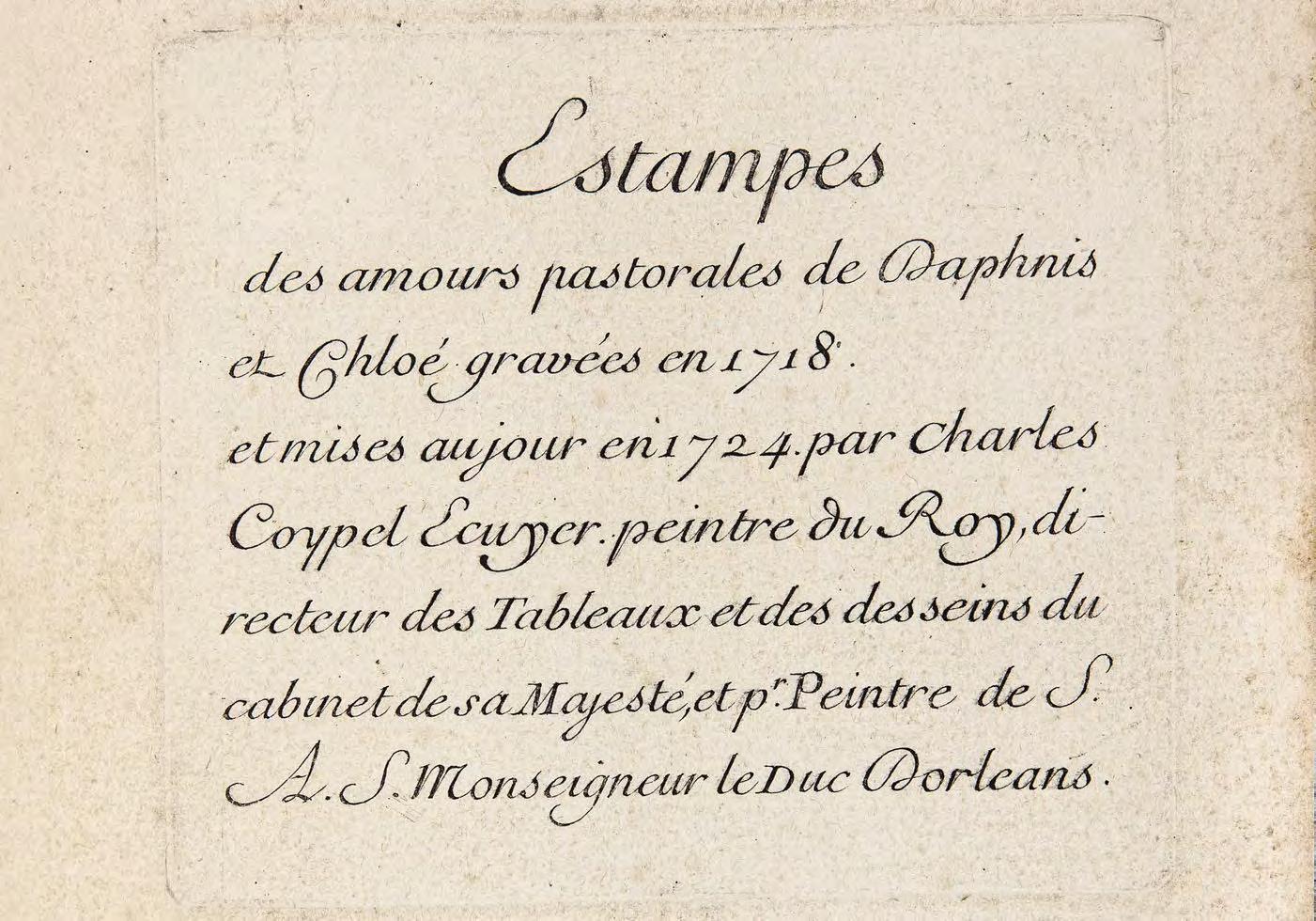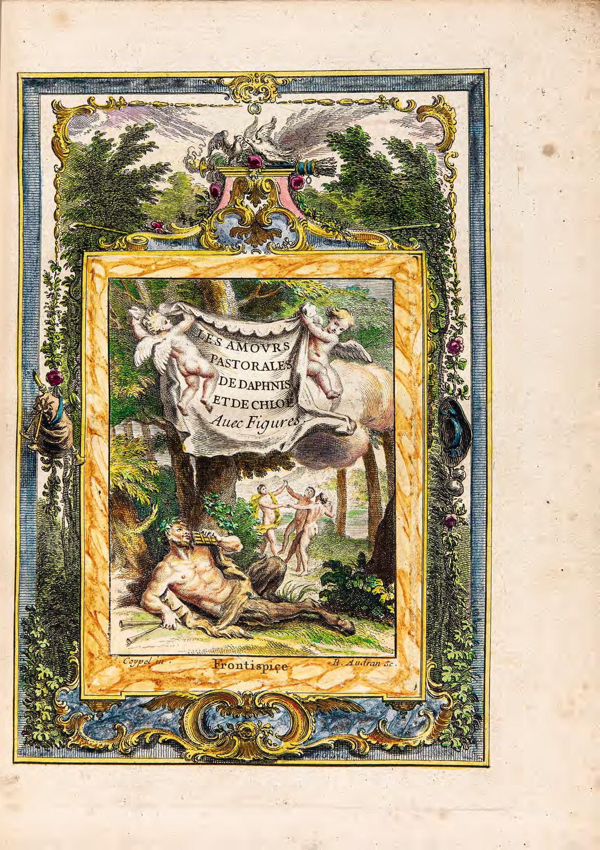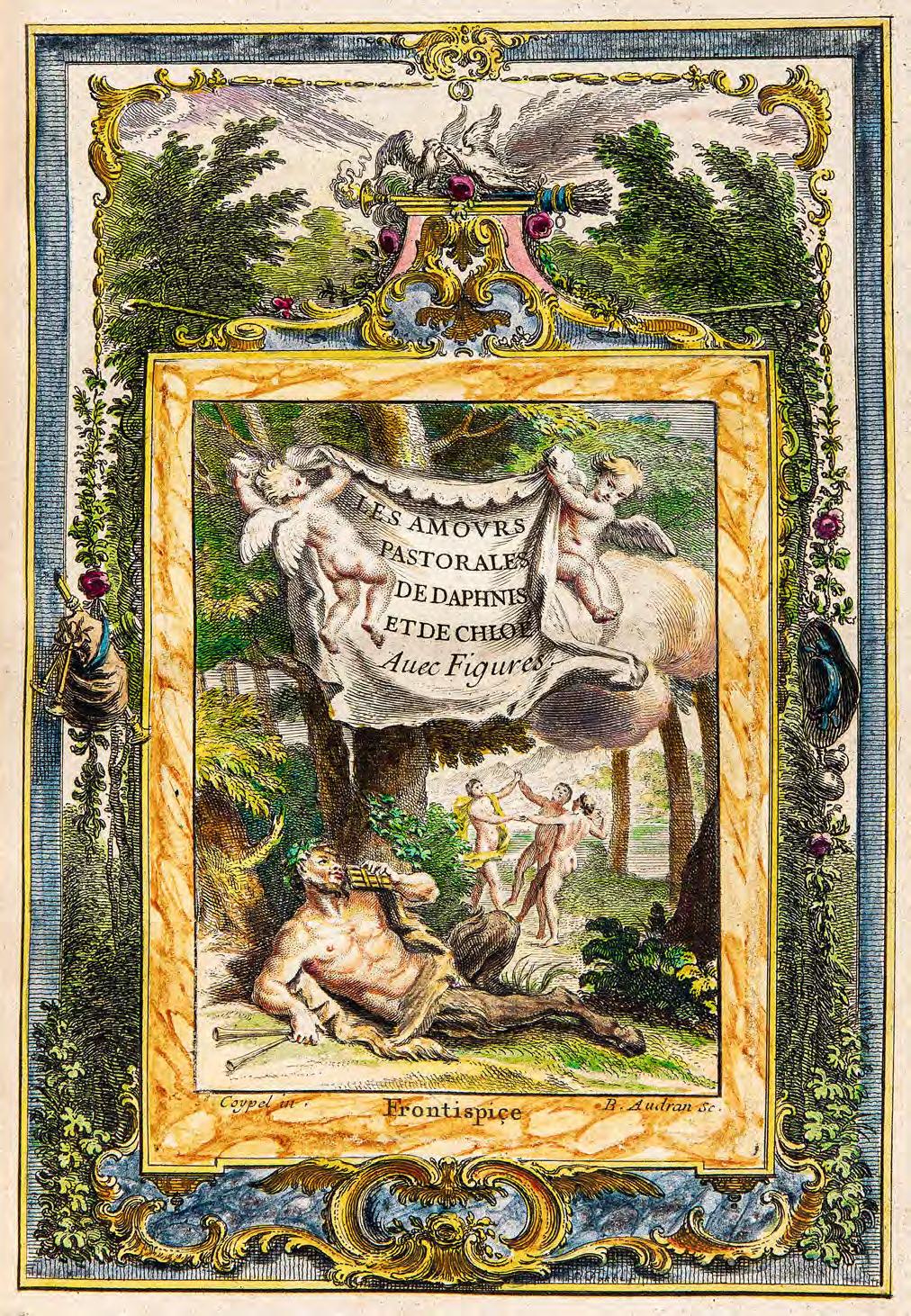 Wahrscheinlich gingen die Entwürfe auf das Jahr 1712 zurück, die Stiche tragen das Datum 1714, und im Jahr 1718 erschien dann die erste Ausgabe mit der sogenannten Suite du Régent. Ihren Erfolg verdankt sie neben der Prominenz des nominellen Schöpfers vor allem der eingängigen Bildsprache Antoine Coypels. Die teils reizvollen, bei den besten Tafeln der Folge sogar durchaus anmutig zu nennenden Illustrationen dürften erheblichen Anteil daran gehabt haben, daß die Amours pastorales de Daphnis et Chloé zu einem der beliebtesten Werke der illustrierten Literatur des Siècle des lumières avancierten. Von nun an war der Roman aus der Buchproduktion in Frankreich nicht mehr wegzudenken, mit einem nicht unbedeutenden Seitenzweig in den Niederlanden, der von Anfang an die französische Hauptlinie begleitet hat; nach etwas zögerlichem Anlauf folgte bald Ausgabe auf Ausgabe, und es wird unser Anliegen im Folgenden sein, dieses bis heute nicht eingehend gesichtete Dickicht ein wenig transparenter zu machen, Zusammenhänge zwischen den Editionen und Illustrationsfolgen aufzuzeigen, bislang nicht identifizierte Drucker zu benennen und den vielen Varianten innerhalb der unterschiedlichen Ausgaben nachzuspüren.