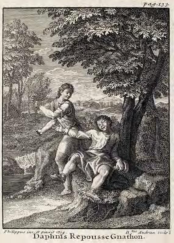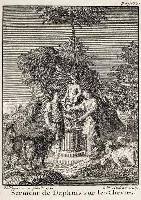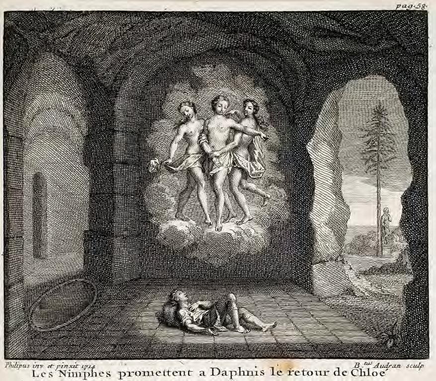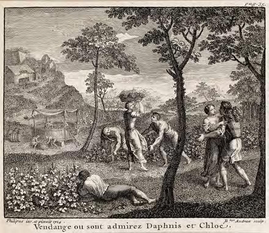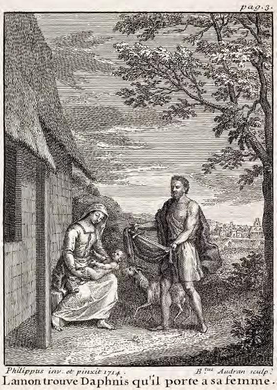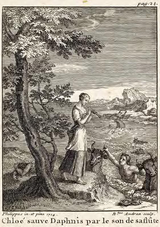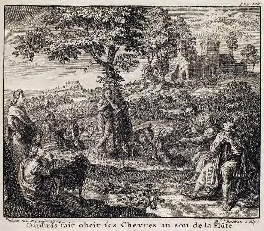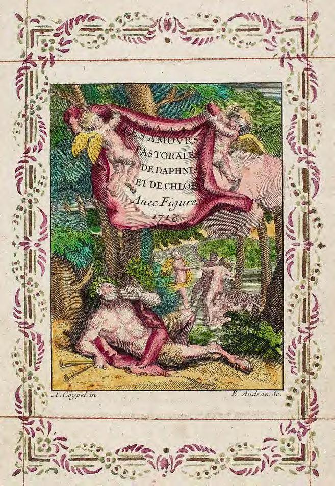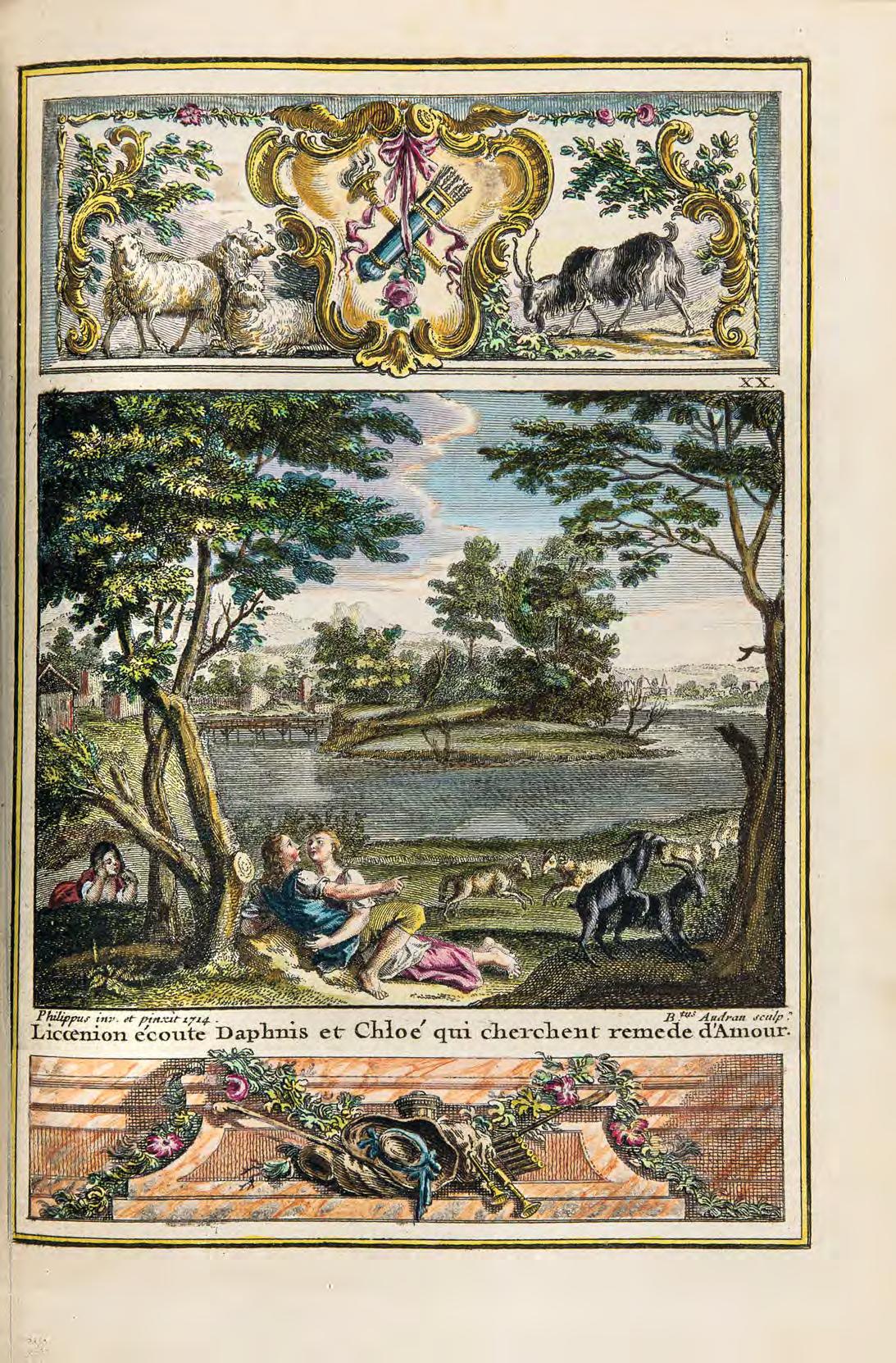 Schon Huet hatte die bildhaften Qualitäten der Sprache des Longus erkannt und hervorgehoben. Die eingängigen, die Phantasie anregenden literarischen Bilder und Szenen in Daphnis und Chloe sind in der Tat derart wirkmächtig gewesen, daß sie Künstler vom frühen 18. bis ins 20. Jahrhundert hinein dazu inspiriert haben, immer wieder neue Illustrationen zu schaffen. Besonders interessant ist in diesem Zusammenhang allerdings, daß der erste große Anlauf zu einer neuen Longus-Illustration, der ziemlich genau in die Zeit unmittelbar vor dem Wechsel des Louis-Quatorze zur Régence fällt, nicht etwa durch die Neuausgabe des Textes angestoßen worden ist, sondern bereits einige Jahre vor dem Druck der neuen Editionen (1716–18) zur Entstehung eines großen, heute leider verlorenen Zyklus von Gemälden geführt hat. Der den Künsten in hohem Maße aufgeschlossene Philipp hatte diese Bilder selbst zusammen mit seinem Mal- und Zeichenlehrer Antoine Coypel, den er 1715 zu seinem „Premier peintre“ ernennen sollte, geschaffen. Vermutlich hatte er eine ältere Longus-Ausgabe in der Amyot-Übersetzung gelesen und war davon derart angetan, daß dieser Impetus ausreichte, einen Zyklus von wohl über 30 Gemälden, einen weiteren mit Tapisserien sowie eine Buchausgabe, illustriert durch die 28 Kupfertafeln umfassende Folge, die Benoît Audran der Ältere nach den Gemälden gestochen hat, hervorzubringen. Wenn sich auch der künstlerische Rang
