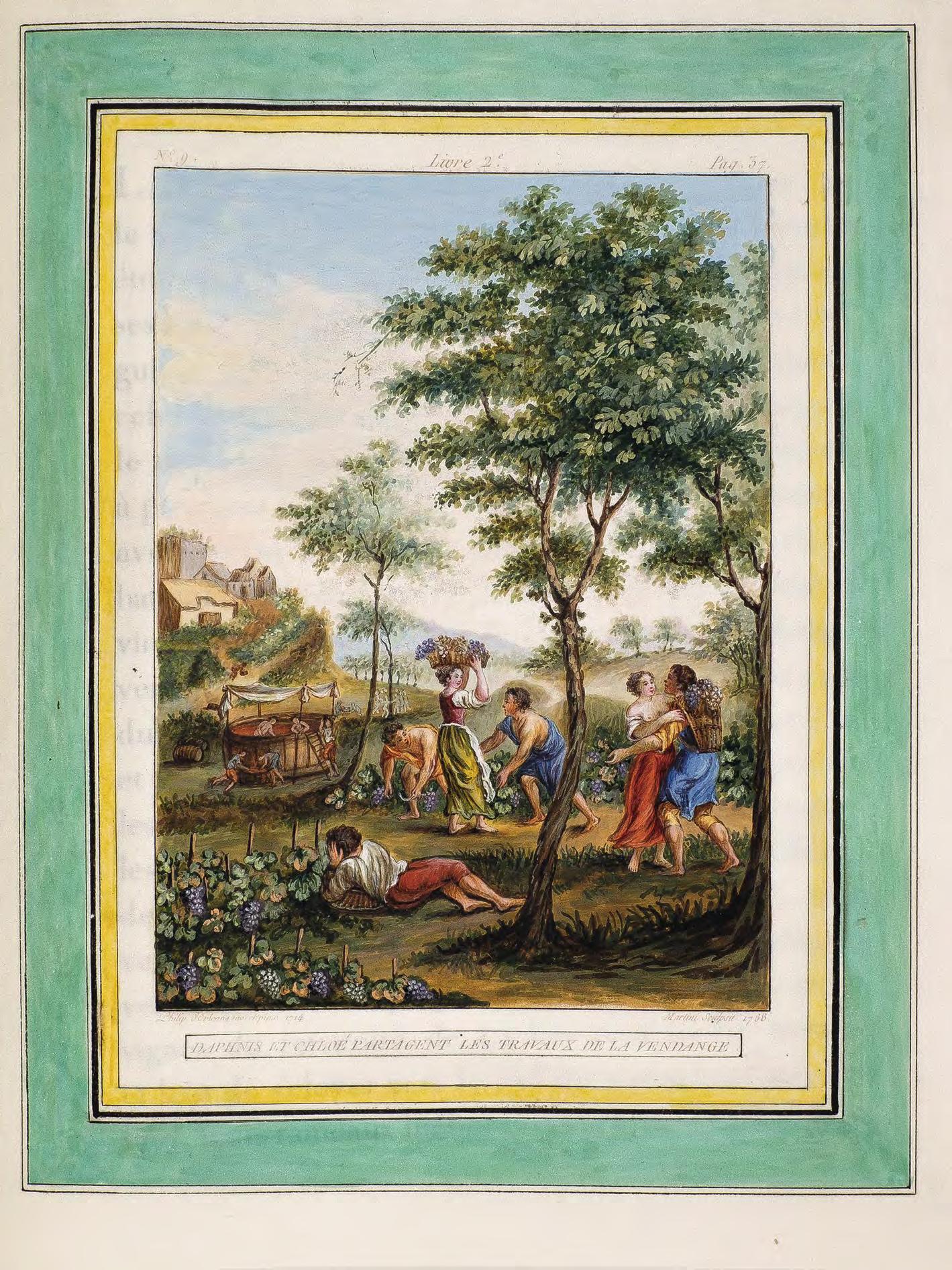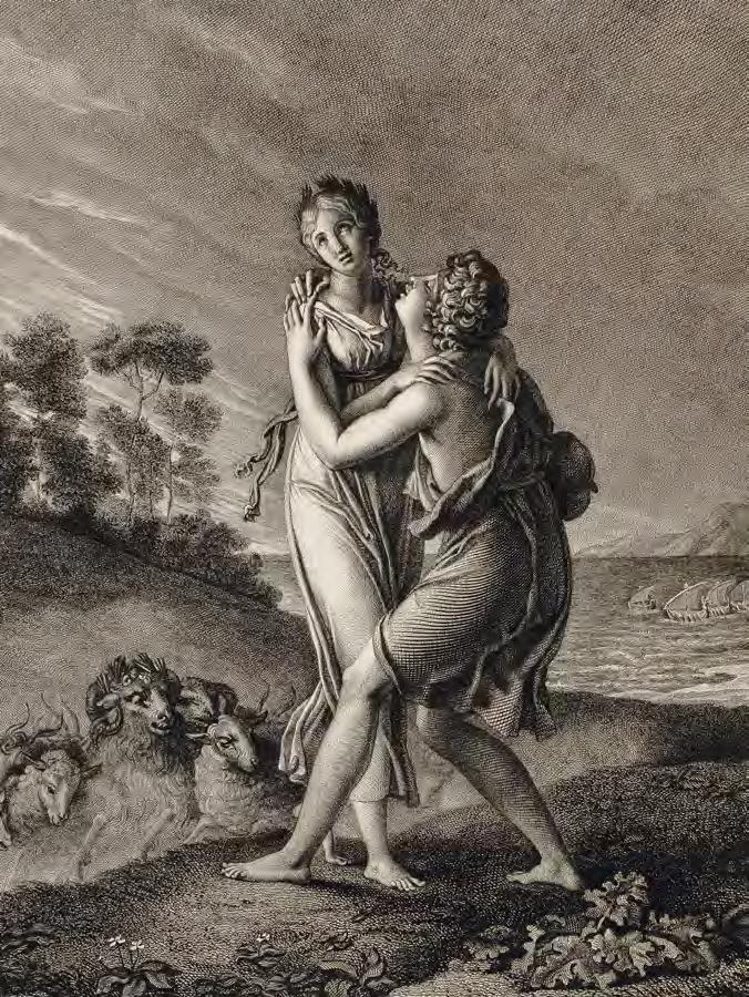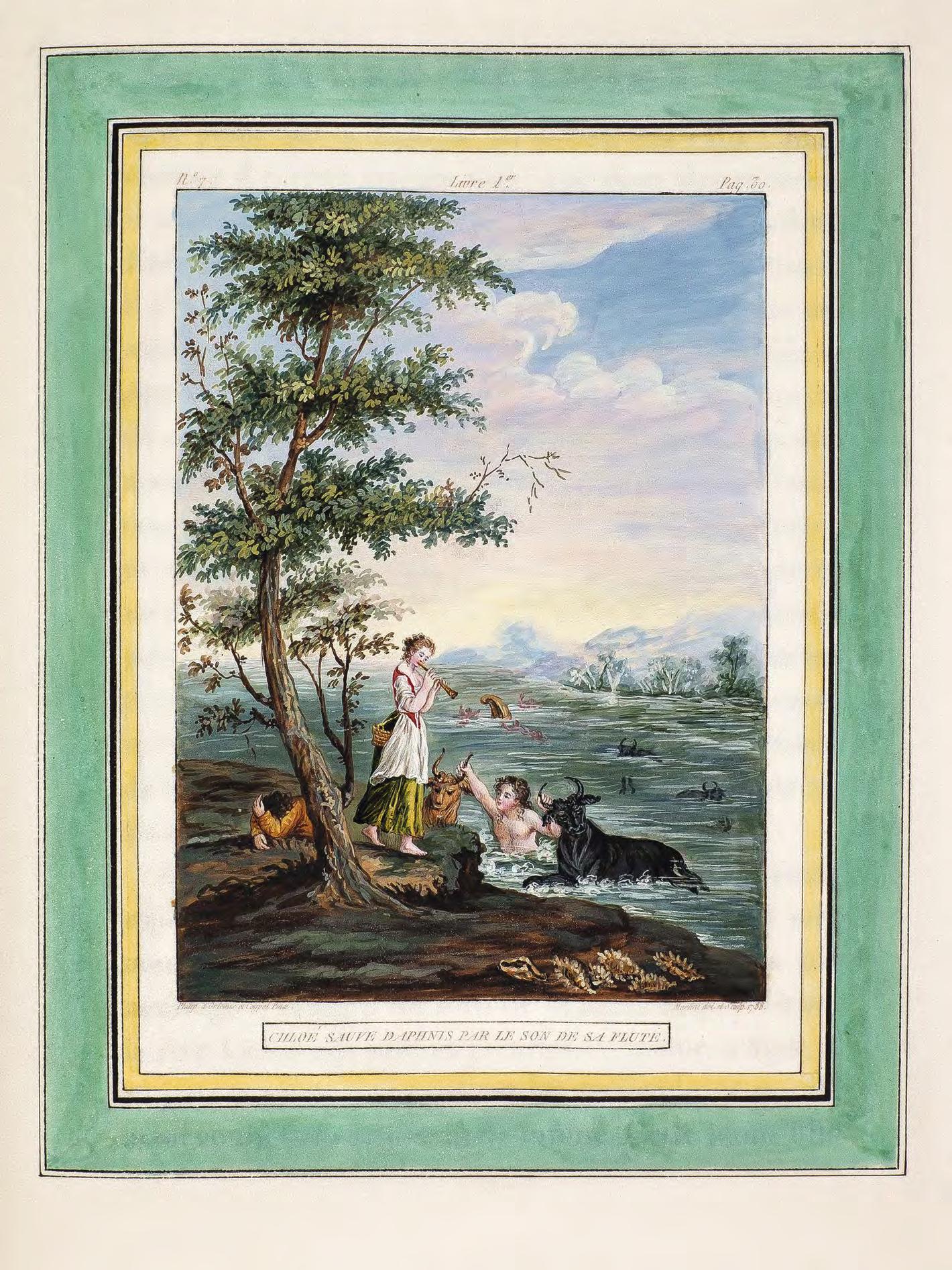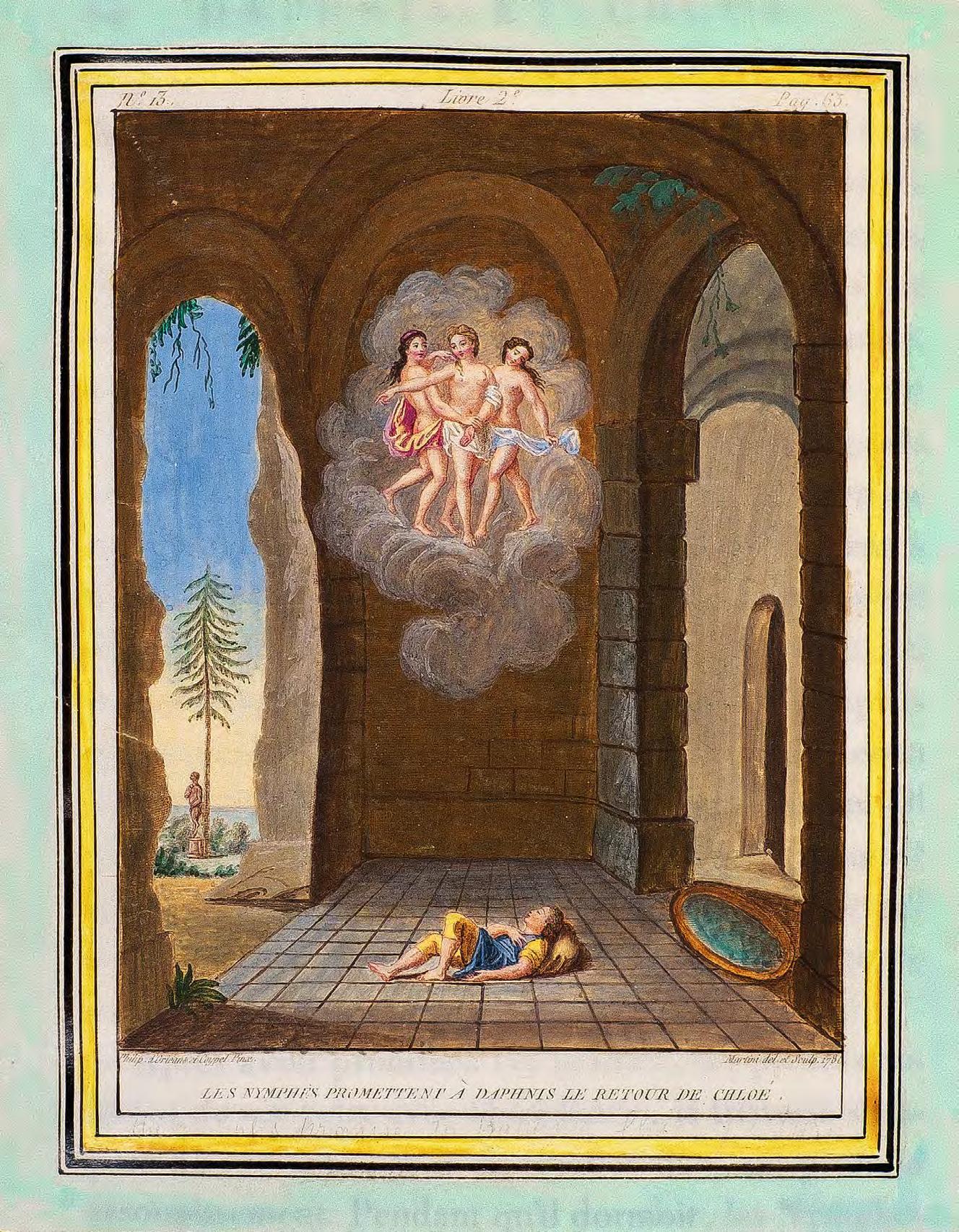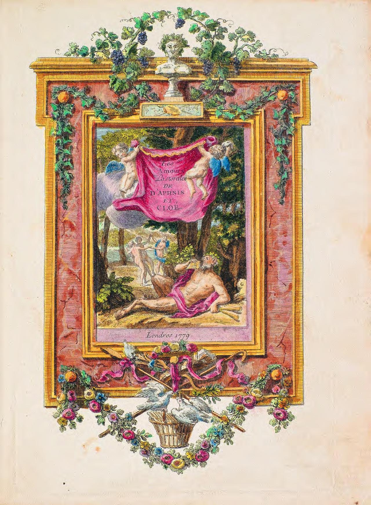 der Mitte des Säkulums sogar aufgewertet durch künstlerisch erstrangiges Rahmenwerk und Vignetten, woran Größen wie Eisen und Cochin maßgeblich beteiligt waren. Erst weit in der zweiten Hälfte des Jahrhunderts wurde diese Regentensuite allmählich durch Neues abgelöst. Gegen Ende des Jahrhunderts schufen schließlich bedeutende Illustratoren wie Le Barbier, Prud’hon und Gérard wirklich neue Darstellungen, auch hinsichtlich einer auf den seelischen Gehalt der Geschichte abzielenden Interpretation, die darin ihrer Zeit gemäßer waren und so in die Bilderwelt des 19. Jahrhunderts mit einer sich stark verändernden Ausdeutung hinüberführten. Die Faszination für das literarische Sujet und seine Visualisierungsmöglichkeiten nahm dabei keineswegs ab, im Gegenteil, sie sollte bis in die Moderne fortdauern, lag sie doch im Werk, nicht zuletzt im Sprachstil des Longus, bereits begründet, wie es Schönberger in der exzellenten Einführung zu seiner Neuübersetzung so treffend beschreibt: „Vor anderen Schriftstellern zeichnet sich Longos durch seine Bildhaftigkeit aus. Kaum ein Dichter vermag es, dem Leser ein Bild so deutlich und plastisch vor Augen zu führen. Man sieht Lokal und Personen geradezu vor sich … Der Klarheit des Himmels entspricht die Klarheit und Plastik der Darstellung“ [Schönberger, Longos, S. 253]. Die bildhaft-schildernde Sprache ist hierbei nur die eine Seite, die andere ist der Stoff selbst, der unmittelbar vom Wesen des Menschen, seinem Gefühls- und Seelenleben, erzählt und daher geradezu prädestiniert war, Bilder und Bilderfolgen zu evozieren, die sich im Laufe der Geistesgeschichte, der Stile und veränderter Interpretationsweisen entsprechend gewandelt und ein ganzes Spektrum visueller Deutungsebenen durchlaufen haben – der gewaltige Bogen der Inspiration der Kunst durch diesen immer wieder faszinierenden und die Phantasie anregenden Text spannt sich von den Kupferstichen des Crispin de Passe im frühen 17. Jahrhundert bis zu den Photographien eines Karl Lagerfeld in unseren Tagen. Das hier behandelte 18. Jahrhundert ist nur ein Ausschnitt daraus, wenn auch ein sehr wichtiger. Doch was machte den Reiz, die Bedeutung sowie die gleichsam zeitlose Attraktivität und Wirkung dieses antiken literarischen Stoffes aus, und warum hat er gerade im Frankreich des 18. Jahrhunderts eine solche Blütezeit erlebt?