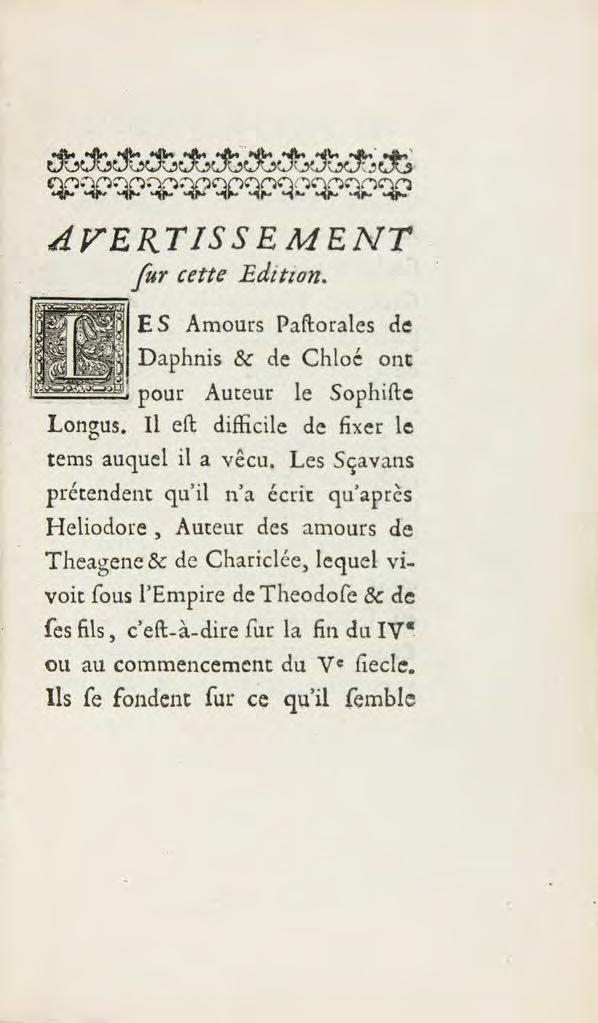 ist, charakterisierte Huet den Sprachstil des Longus als „simple, aisé, naturel, & concis sans obscurité; ses expressions sont pleines de vivacité & de feu; il produit avec esprit; il peint avec agrément; il dispose ses images avec adresse; les caracteres sont gardez éxactement; les épisodes naissent de l’argument; les passions & les sentiments sont traitez avec une délicatesse assez convenable à la simplicité des bergers“. Eben jene Passage wurde bei der Besprechung der Pariser Edition des Jahres 1716, der ersten Daphnis-und-ChloeAusgabe des 18. Jahrhunderts, im Journal des Sçavans vom 4. Januar 1717, ausführlich zitiert [S. 14 f. – siehe auch Barber, Daphnis and Chloe, S. 30].