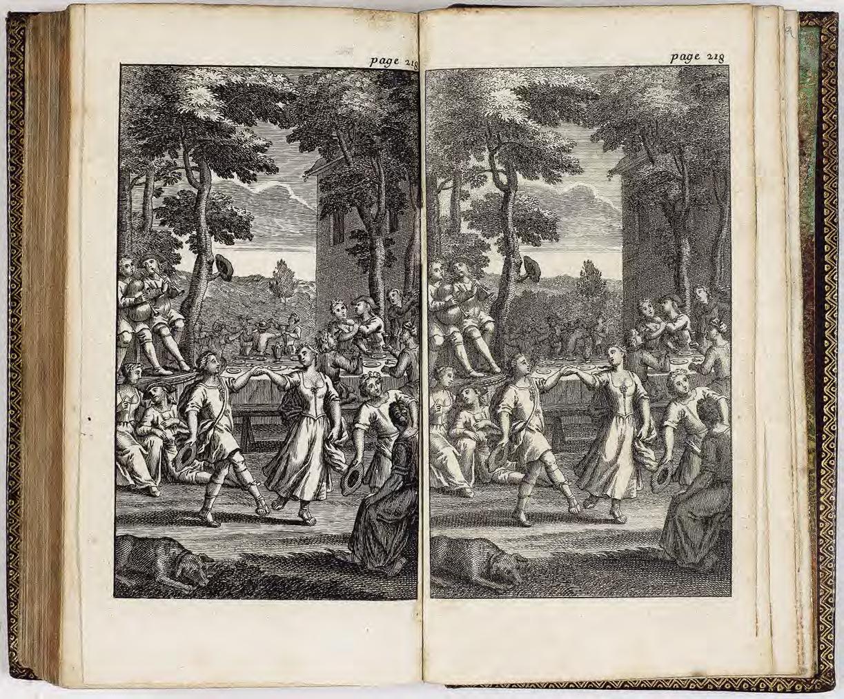 Nun sind die Impressa dieser Editionen sämtlich zweifelhaft und bis heute ungeklärt, und das ist auch der Hauptgrund, warum die Entstehungsgeschichte der Drucke weitgehend im Dunkeln liegt. Der wahrscheinlich erste der drei aus dem Jahr 1716 firmiert unter der Adresse „A Paris, chez les Héritiers de Cramoisy“ und wird auf dem Titel als „Nouvelle Édition“ ausgegeben (Anhang A). Was es mit diesen Angaben für eine Bewandtnis hat, werden wir gleich näher betrachten. Im Gegensatz zu den früheren Ausgaben des Romans in der Amyot-Fassung, der Erstausgabe von 1559 und der folgenden der Jahre 1578, 1594, 1596 und 1608, ist diese Neuedition jedenfalls illustriert, demnach ist sie in dieser Übersetzung die erste mit Bildern, bestehend aus einem dekorativen gestochenen Titel und acht Tafeln, die die wichtigsten Ereignisse in eingängigen Szenen darstellen.