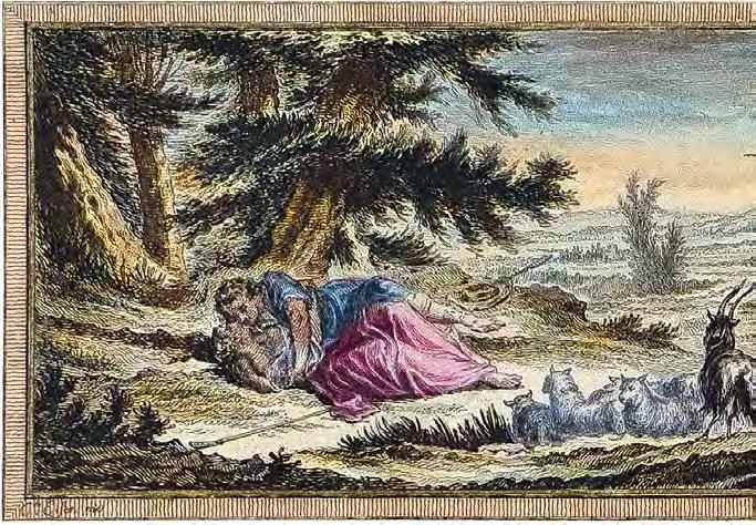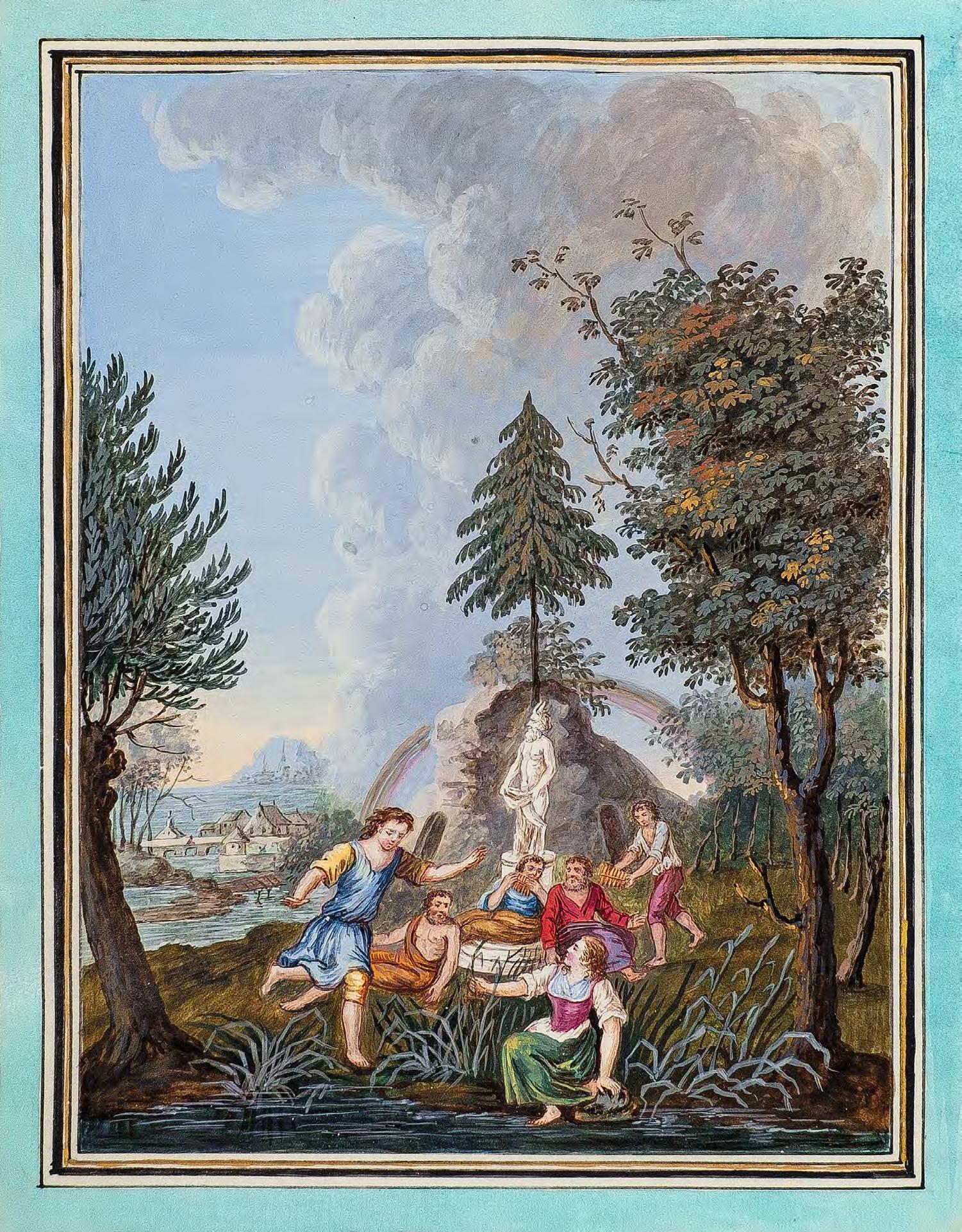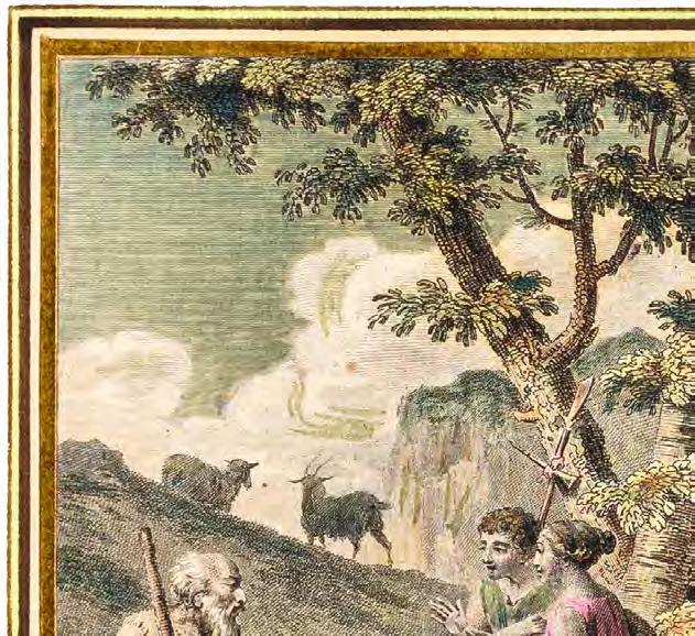 Ähnliches gilt für alle folgenden Editionen, vor allem die von 1745 und 1757, um gegen Ende hin, d. h. 1787 und 1800, bei zwei Abendsternen zu landen, die in der Welt des Dixhuitième so nur einmal existieren: die Nummern LIX–LXI mit drei Folio-Exemplaren auf Pergament, darunter zwei mit nur für diese beiden vergrößert geschaffenen Original-Gouachen, das dritte gar mit allen Originalzeichnungen und den nur dies eine Mal anhand der Gemälde selbst gouachierten Radierungen. Hat man diese Wunderwerke einmal durchstaunt, dann bleiben in uns, wie von einer äußersten Lichterscheinung auf dem Grund unseres Auges, leuchtende Urbilder zurück, ein Kreisel der Farben: birkenlaubgrün, taubenhalsfarben, zwischenein das memlinghafte Inkarnat einer Hirtin bei der Verkündigung aus den Wolken.