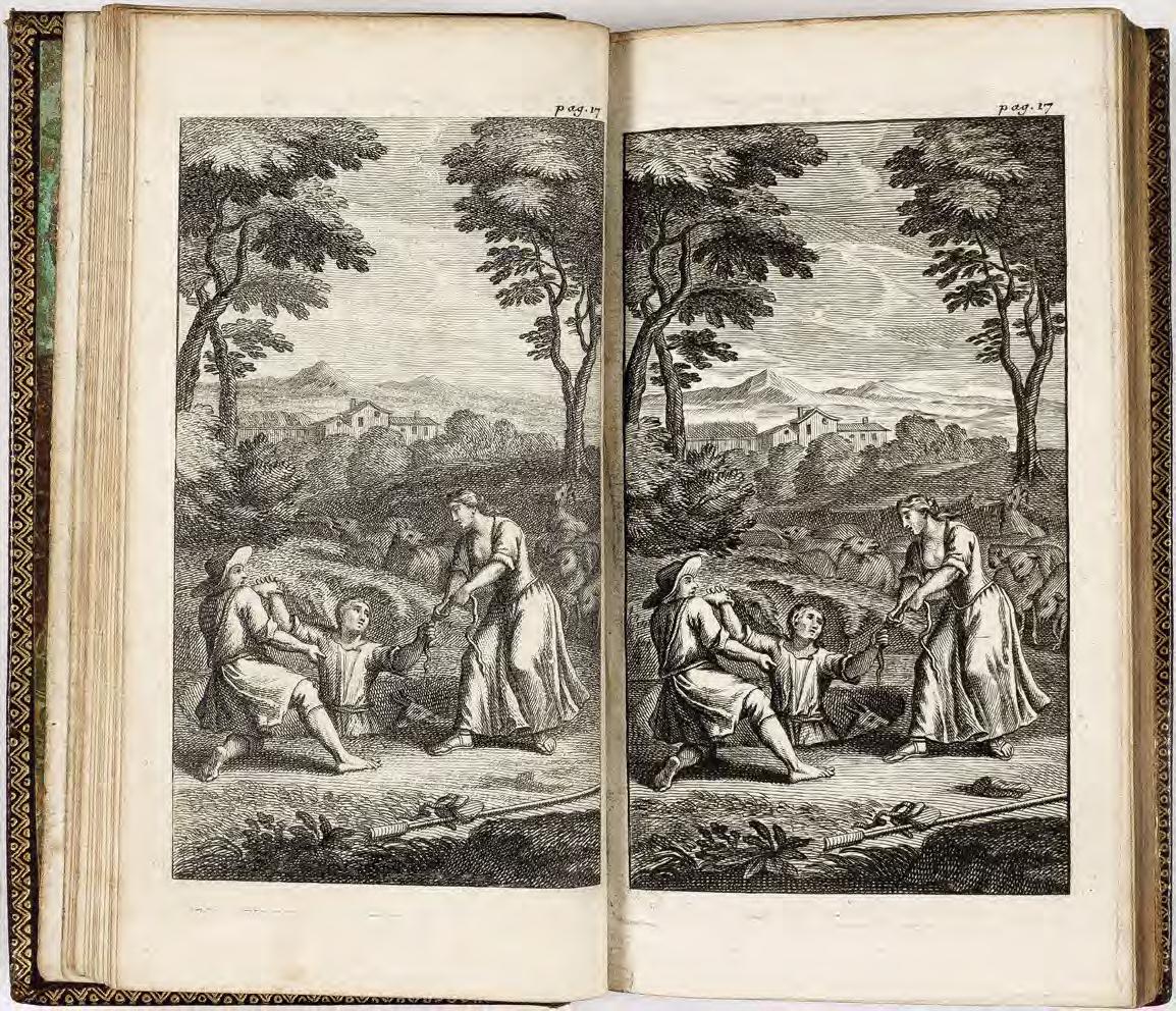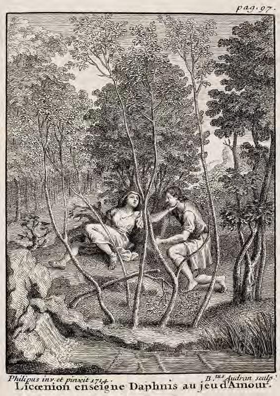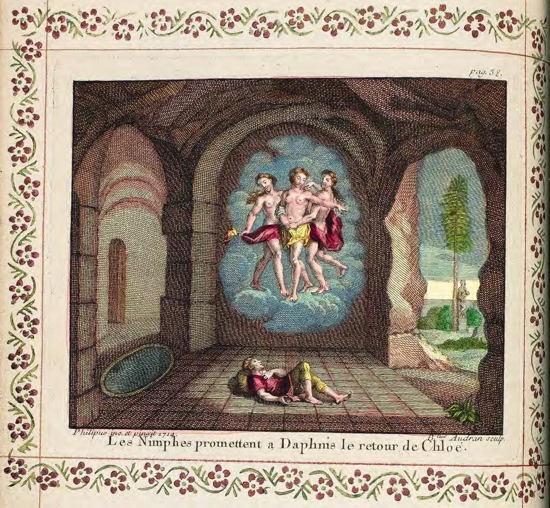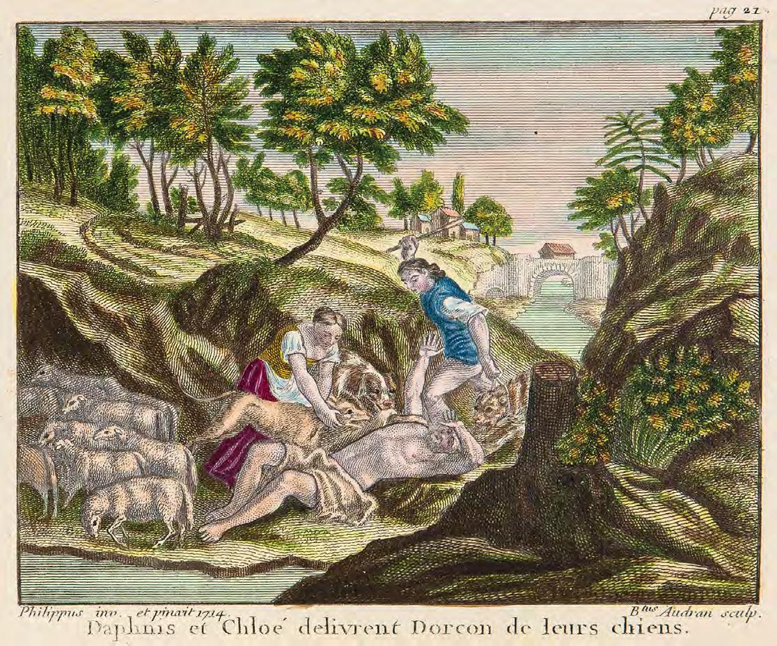 Blieben die französischen Editionen des 16. und 17. Jahrhunderts noch sehr wenige, und darunter auch nur vereinzelt illustrierte, allesamt höchst seltene Drucke von geringer Verbreitung, so begann erst im frühen 18. Jahrhundert die eigentliche Blütezeit, in der das Werk in immer neuen Ausgaben, die meisten davon mehr oder weniger reich illustriert, erschienen ist. Mehrere kulturelle und geistesgeschichtliche Entwicklungen mögen dazu beigetragen haben, ganz konkret setzte dieser Aufbruch aber eine veränderte Bewertung der sittlich-moralischen Relevanz des Inhalts voraus. Dies ist nicht verwunderlich, denn aus dem Text sind tatsächlich zwei gegensätzliche Interpretationstendenzen ableitbar – die sich im Übrigen auch in der Geschichte seiner Illustration widerspiegeln: die eine, die das erotische Element als übermächtig ansieht, da der Eros hier ja omnipräsent ist und schicksalhaft zu walten scheint, was, so wurde dann meist unterstellt oder ausgedeutet, mit lockerer Moral, bis hin zur Frivolität einherginge, die andere, die in der Entwicklung des Paares einen natürlichen und vorherbestimmten Weg sieht, paradigmatisch für die menschliche Natur an sich. Und die zudem darauf verweisen konnte, daß aus der naturgegebenen Anziehung zwischen den beiden am Ende eine auch im zivilisatorischen Sinne legitimierte Verbindung hervorgeht, eine Eheschließung. Moralisch wäre dem Verlauf der Geschichte, sieht man von der ohnehin durch die Übersetzer stark gekürzten Verführungsszene des Daphnis durch Lykainion, eine aus der Stadt stammende Frau eines Bauern, einmal ab, mithin nicht viel entgegenzuhalten. Die Verlagerung von der einen Sichtweise zur anderen geschah in Frankreich in der Zeit Ludwigs XIV. Im mittleren 17. Jahrhundert noch als sittlich bedenkliche Schrift eingestuft, galt der Roman schon gegen Ende des Jahrhunderts sogar für junge Frauen als empfehlenswerte Bildungslektüre. Dies ist eine grundlegende Voraussetzung für seine weitere Verbreitung, sollte diese nicht von der Zensur wesentlich behindert oder durch einen Eintrag in den kirchlichen Index eingeschränkt werden, doch ist das noch keine Erklärung für die schließlich erlangte Popularität. Um diese zu verstehen, ist zunächst einmal zu sehen, daß sich der Roman des Longus am Ende des 17. Jahrhundert bereits in seine eigene neuzeitliche Nachfolge eingebettet befand. Als Urbild des Hirtenromans war ihm eine ganze Gattung gefolgt, die sich in Renaissance und Barock so großer Beliebtheit erfreute, daß man von einer Mode sprechen kann. Sie machte „Lope de Vega und Shakespeare zu ihren begeisterten Nachahmern“ und bildete „von Petrarca bis zum Biedermeier den Nährboden einer unerschöpflichen Landidyllik und Schäfersehnsucht“ [ KNLL 10, 580]. Er schwamm also auf der Welle, die er selbst ausgelöst hatte.