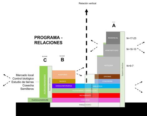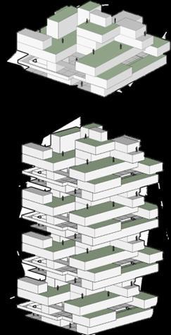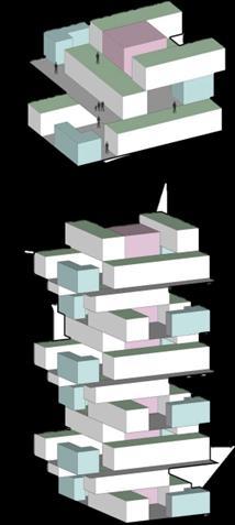 Durante el proceso de diseño se generan tres torres producto de las proto secciones, las cuales van a albergar diversos usos y tipologías de viviendas, estas torres se encuentran articuladas por medio de una circulación vertical descontinua como también a través de plataformas