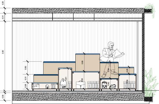 La intensión de esta idea, parte de realizar el detalle de un modulo, el cual compone el estand comercial, para esto se representa en diversas perspectivas con intensión de comprender a mayor profundidad este ecosistema, también se toma un mueble en especifico donde se da a entender su uso y su función.