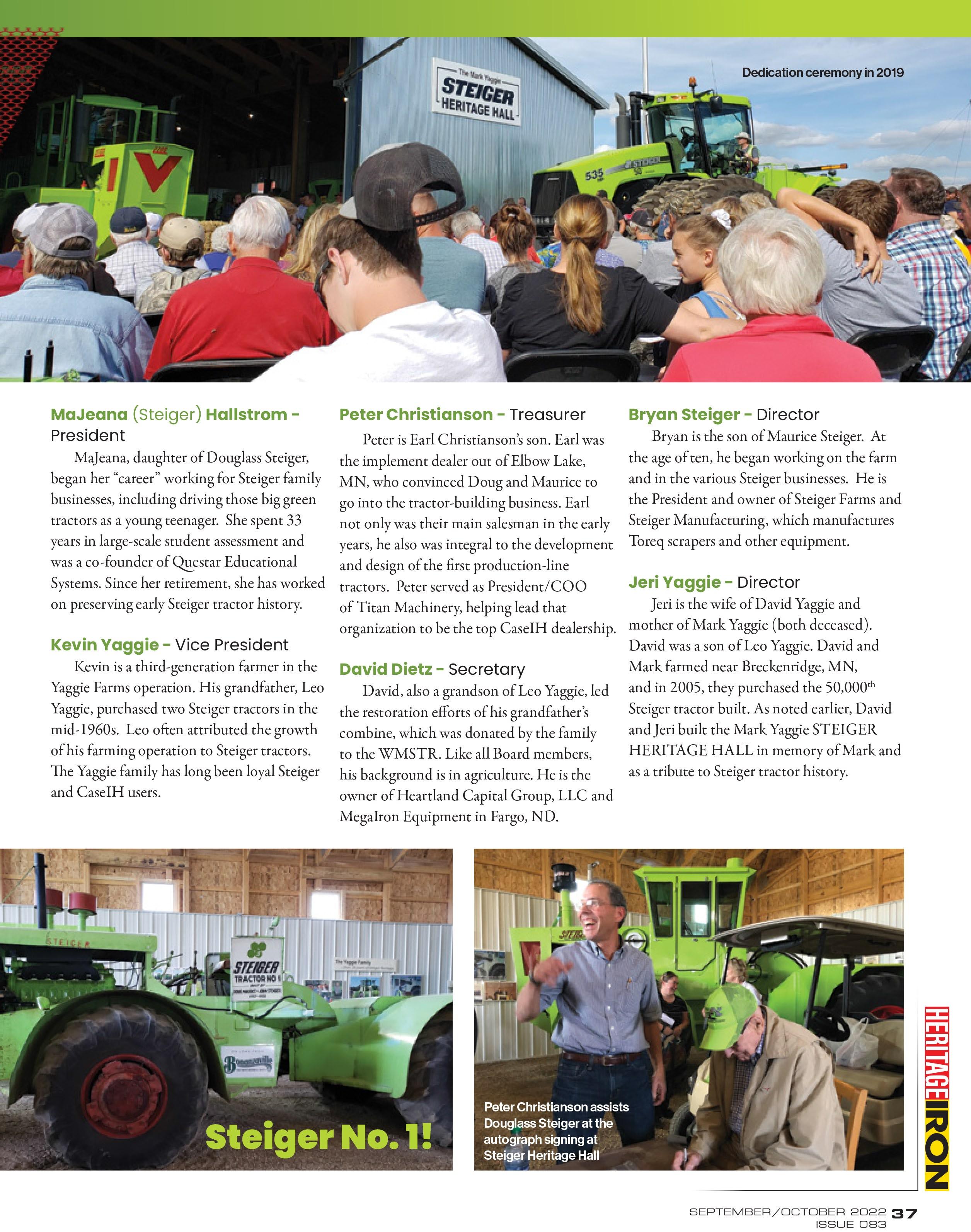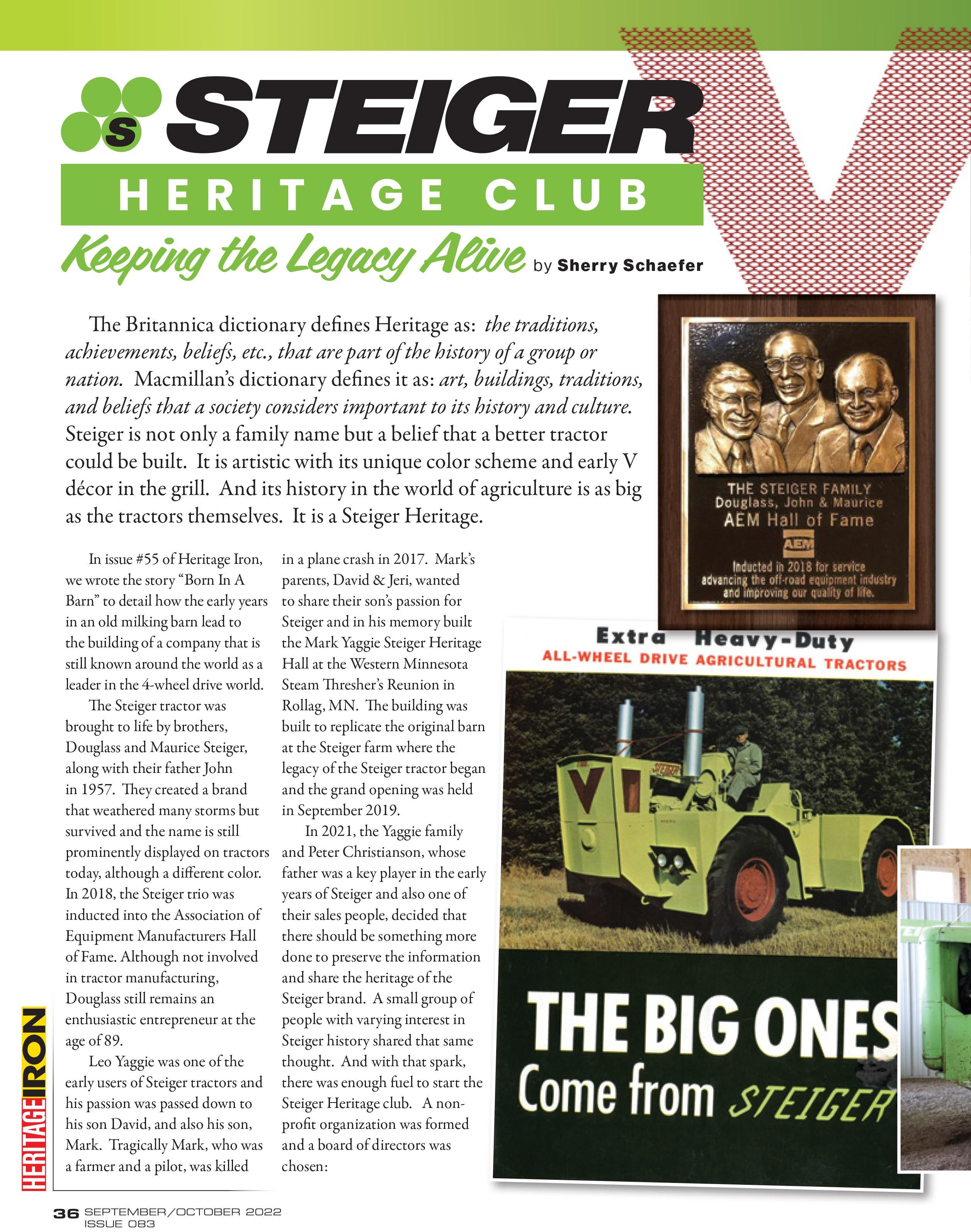 The Britannica dictionary defines Heritage as: the traditions, achievements, beliefs, etc., that are part of the history of a group or nation. Macmillan’s dictionary defines it as: art, buildings, traditions, and beliefs that a society considers important to its history and culture. Steiger is not only a family name but a belief that a better tractor could be built. It is artistic with its unique color scheme and early V décor in the grill. And its history in the world of agriculture is as big as the tractors themselves. It is a Steiger Heritage...