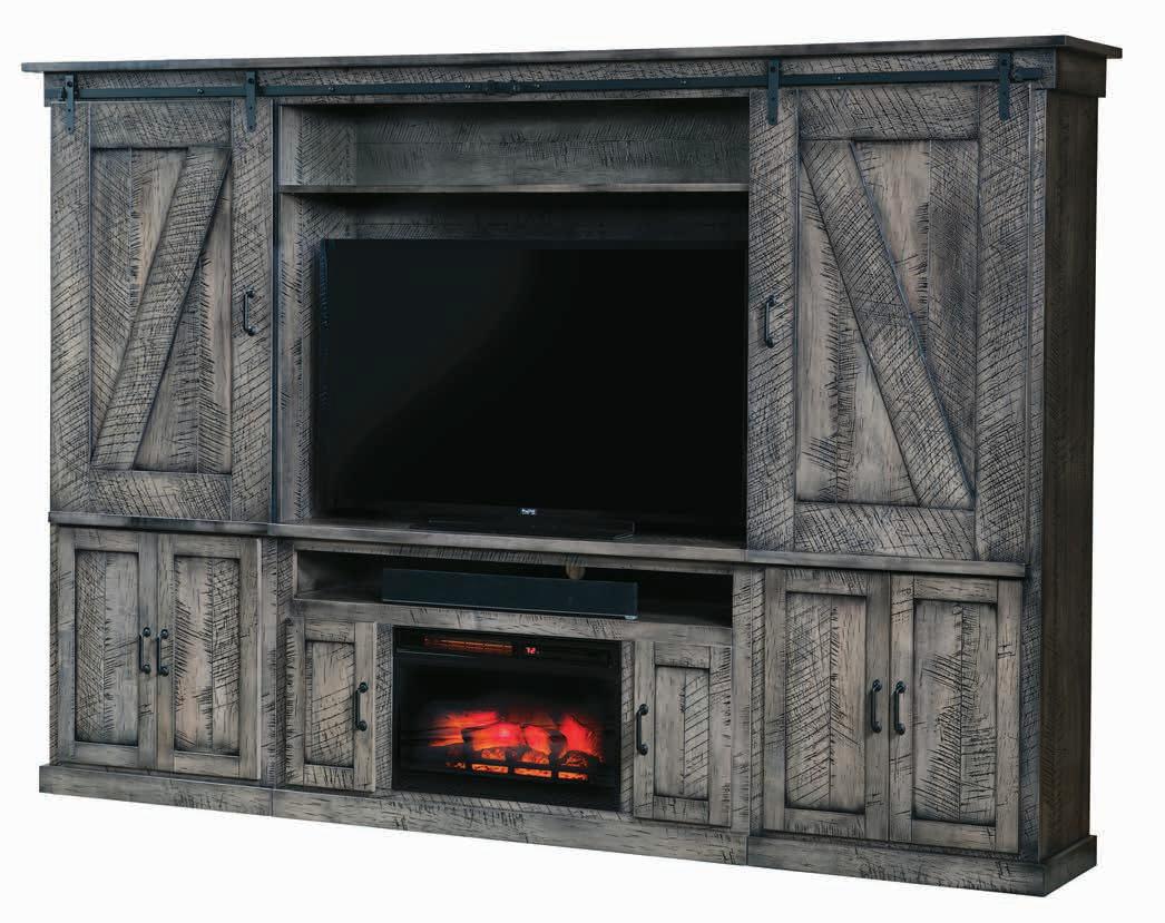 All the necessary storage and convenience is hidden behind a rustic barn door look