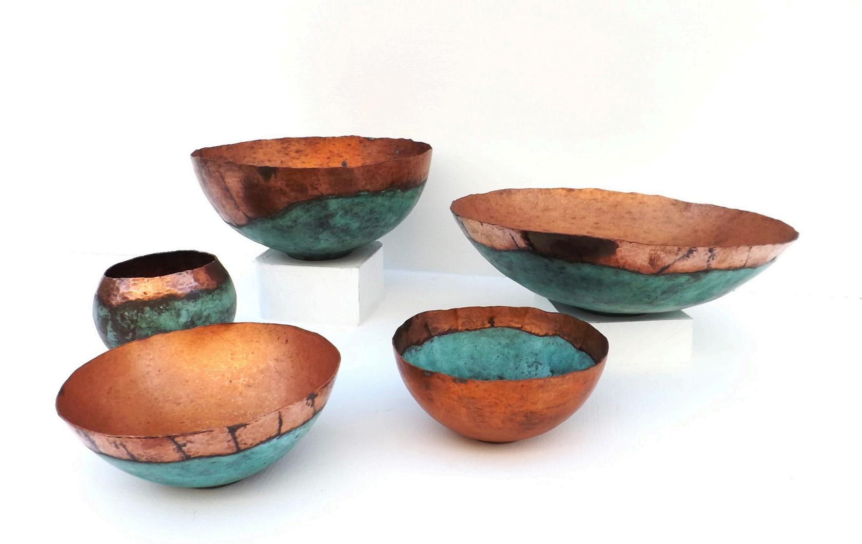 I am a coppersmith working in Cornwall. This picture shows several raised copper bowls, the largest is 25cm in diameter and the small rounded bowl measures 9cm high. They have all been coloured using a traditional verdigris patina, applied while the object is warm. Then finished with several layers of beeswax to protect the patina.